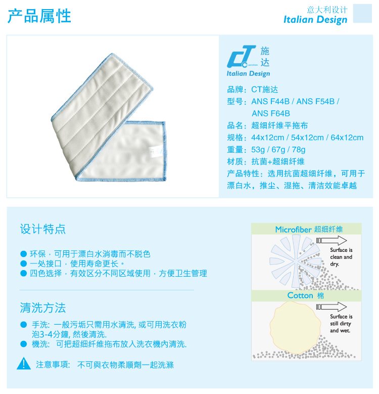 施達 乾濕兩用微纖平拖布 藍色 44cm