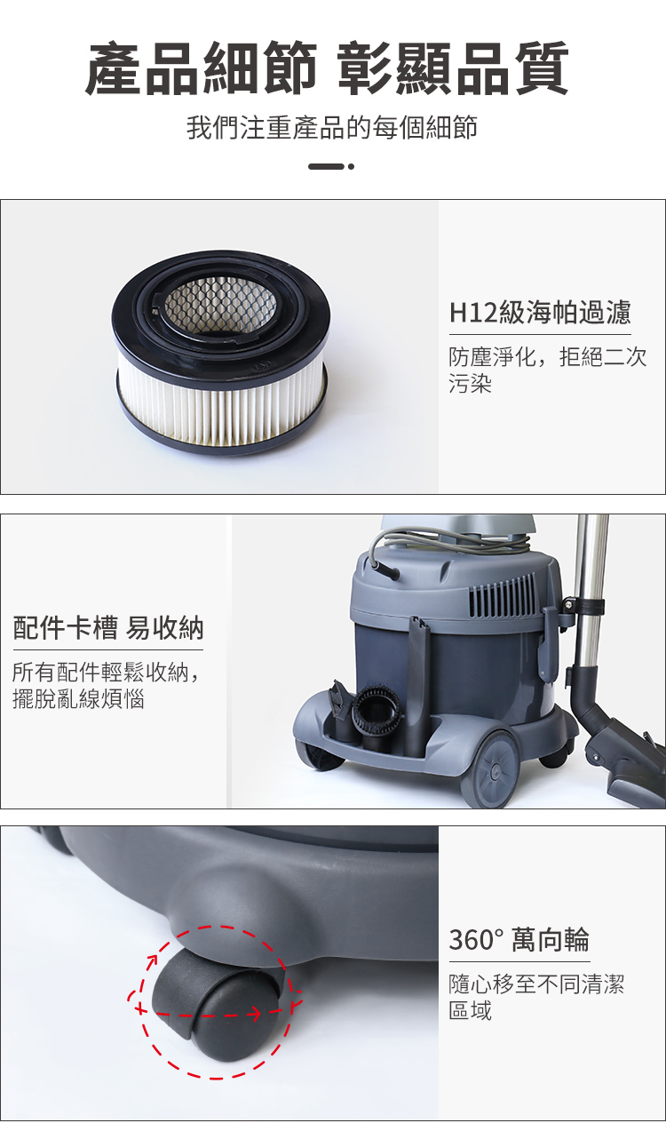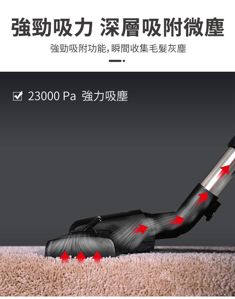 2、1200W,單相串聯電動機,23000Pa,吸力強勁,強力吸塵