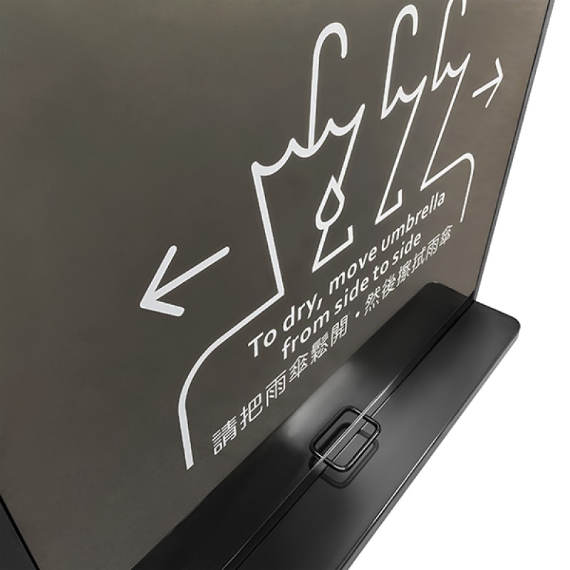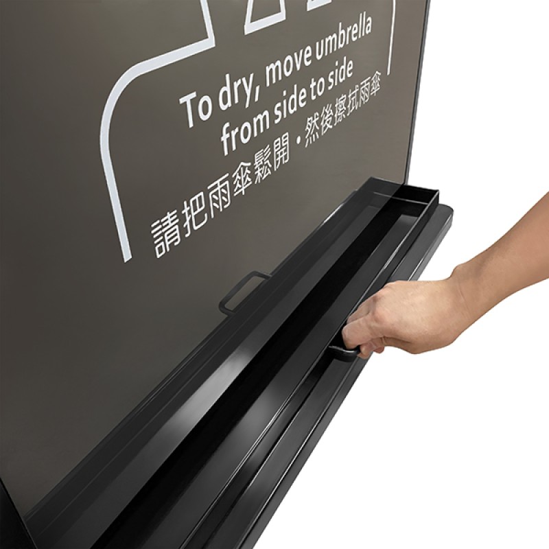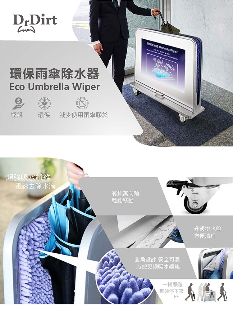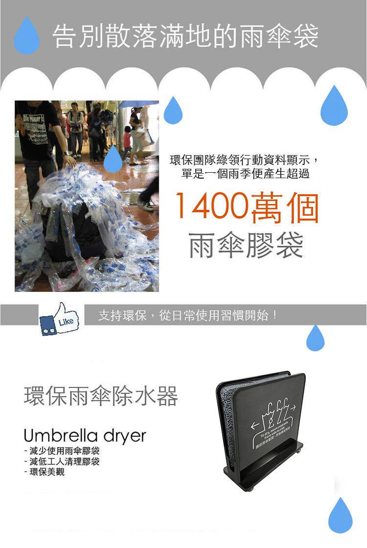 環保雨傘除水器Umbrella dryer,操作簡單,安裝簡便,無需用電,只需2-3個簡單的步驟,就能除去雨傘上的水份,保持室內地面清潔乾爽,並能有效減少使用雨傘塑膠袋,真正環保節能!現時,在日本等多國已流行除水器,可減少在下雨天商場、屋苑、商業大廈過多使用雨傘袋的情況,亦可提昇管理的形象。