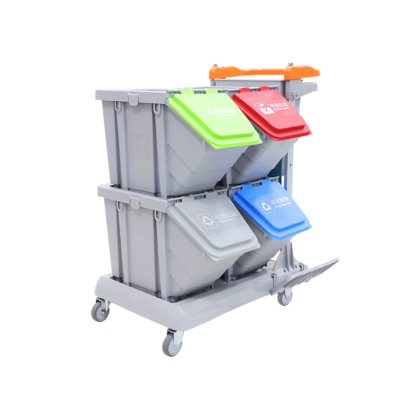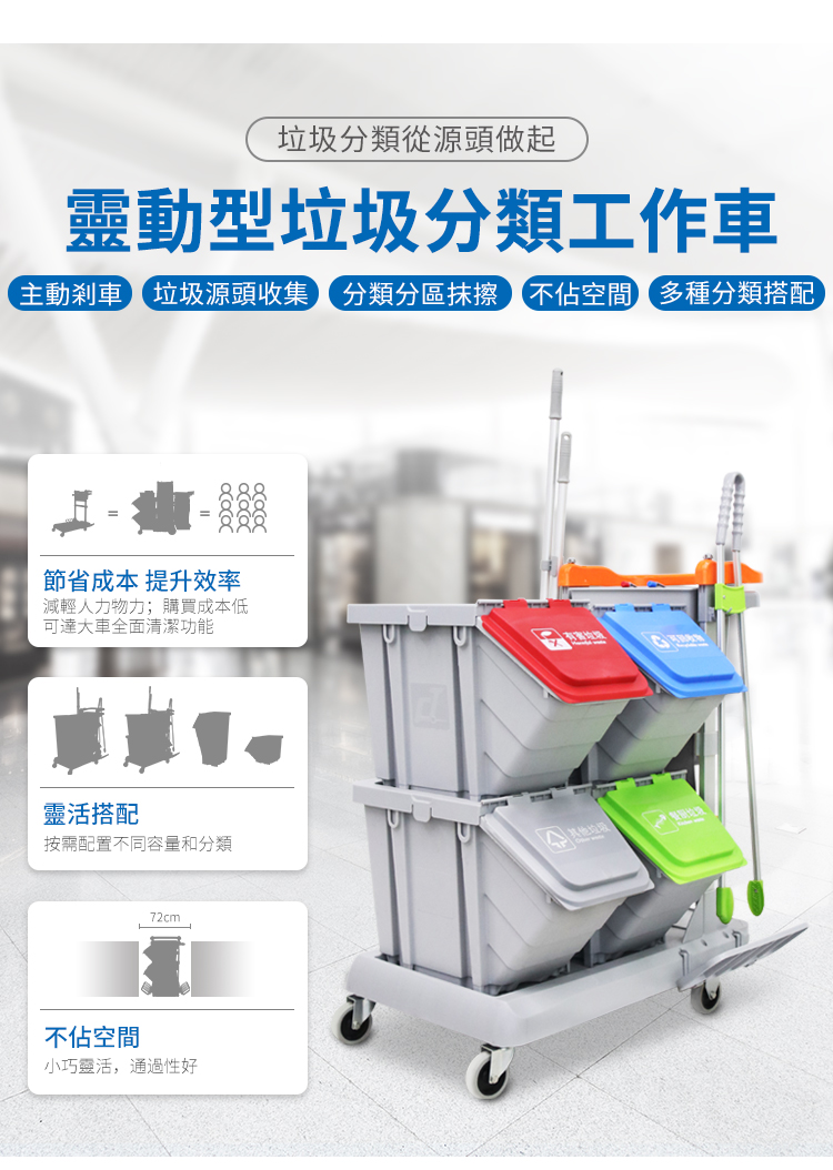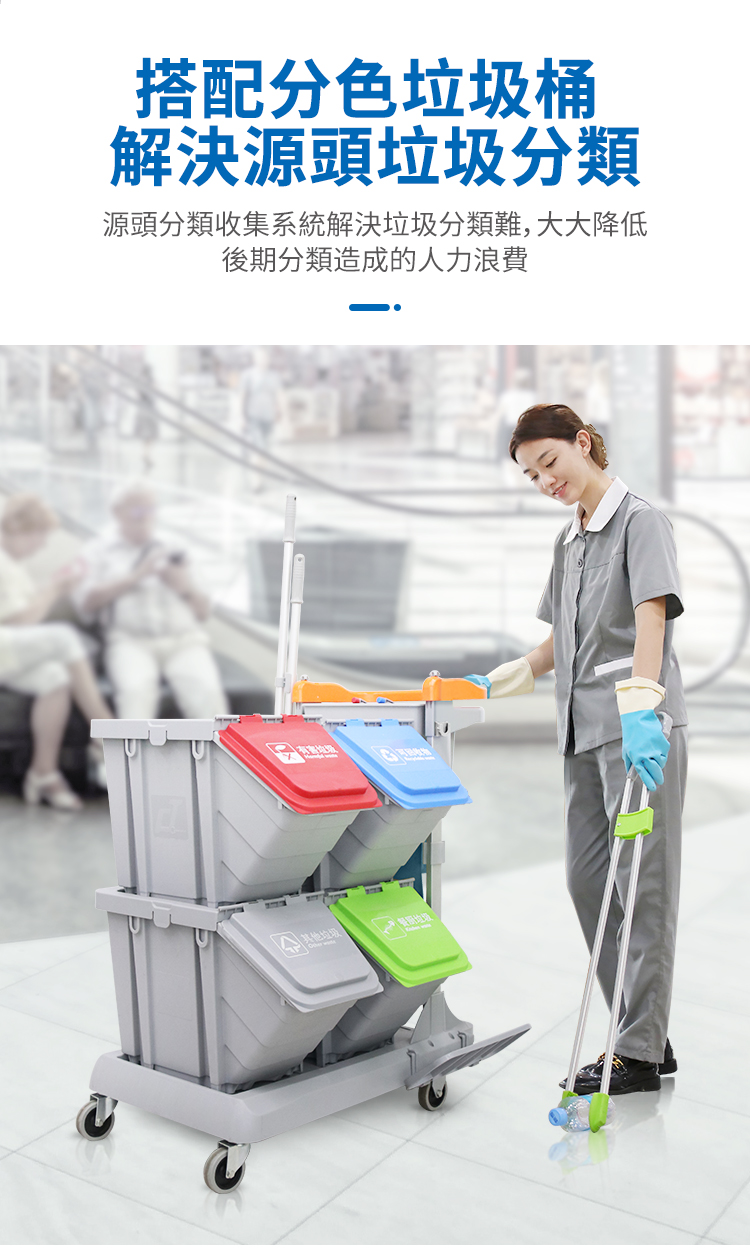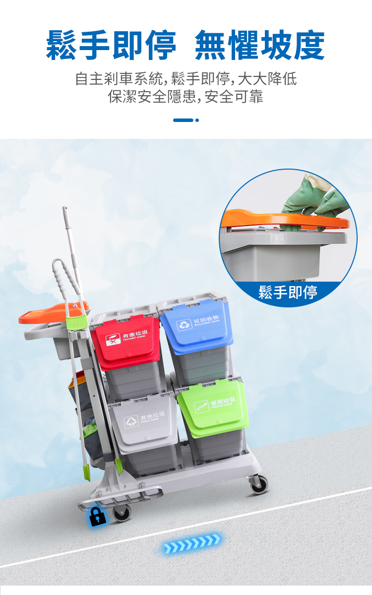 施達靈動型分類分類回收清潔車,轉為解決小範圍流動專項清潔而設計的。分類收納系統清潔車從源頭上配備垃圾分類的功能,加上無污水的清潔清潔方式,垃圾分类回收手推车為您節省垃圾分揀、節約用水的時間和成本,顯著提升工作效率。Nimble Janitorial Trolley 通用的底盤框架,可以因應不同崗位和場所配備相應的清潔系統模塊,實現一車多用,降低採購數量和成本。符合對環境衛生要求高的場所,如醫院、酒店、餐廳等地方。特別配備的自主剎車系統,做到鬆手即停,安全可靠,降低清潔進行中的安全隱患。