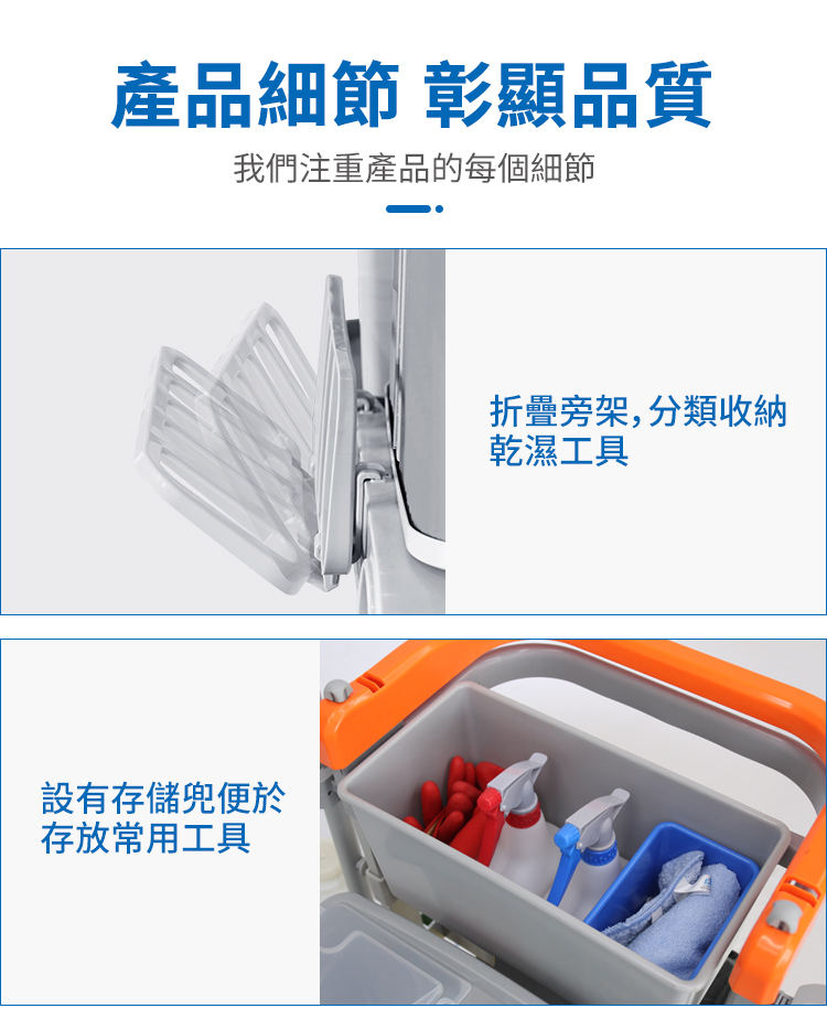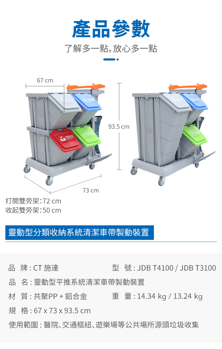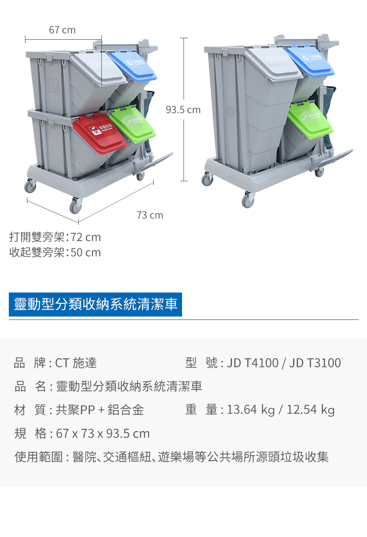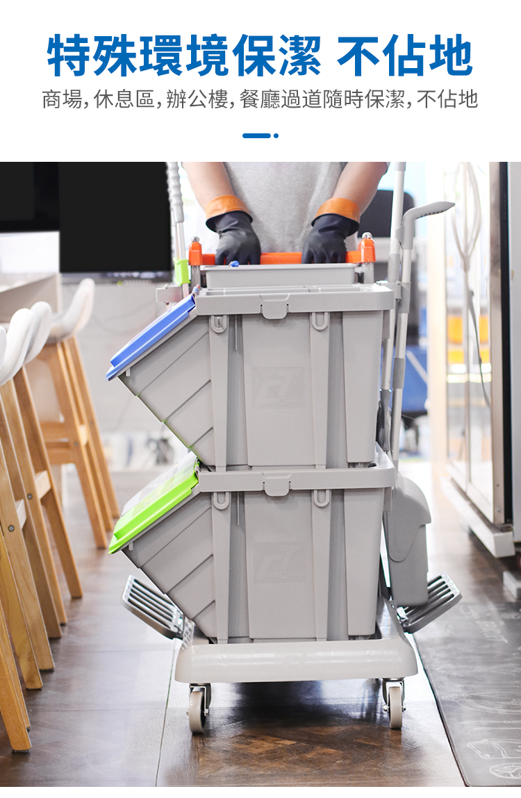 施達靈動型分類分類回收清潔車,轉為解決小範圍流動專項清潔而設計的。分類收納系統清潔車從源頭上配備垃圾分類的功能,加上無污水的清潔清潔方式,垃圾分类回收手推车為您節省垃圾分揀、節約用水的時間和成本,顯著提升工作效率。Nimble Janitorial Trolley 通用的底盤框架,可以因應不同崗位和場所配備相應的清潔系統模塊,實現一車多用,降低採購數量和成本。符合對環境衛生要求高的場所,如醫院、酒店、餐廳等地方。特別配備的自主剎車系統,做到鬆手即停,安全可靠,降低清潔進行中的安全隱患。