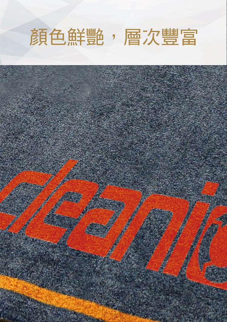 -Logo Mat選用高強耐磨尼龍纖維獨特噴染技術生產,能最大程度展示生產噴染出各種複雜圖案、花式及風格效果,色彩艷麗,層次鮮明。