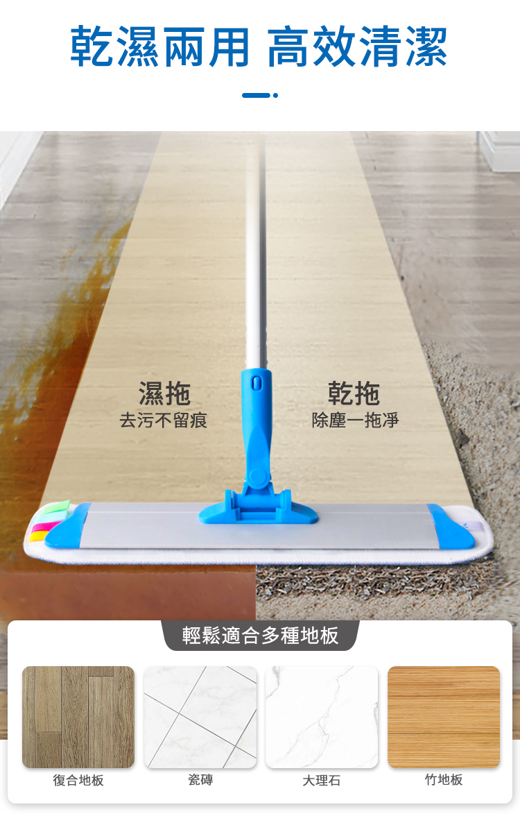 - 適合木板地面、瓷磚地面和石材地面的清潔