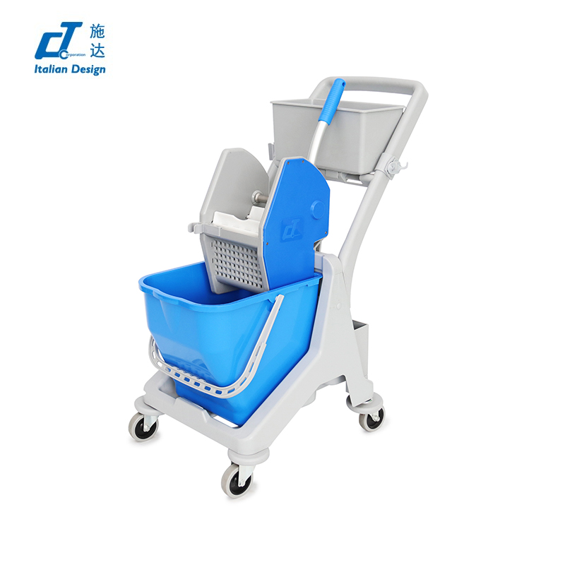 JT 25B迷你清潔服務車,配有專門的膠車架,可以輕鬆推著去清潔,邊度髒就推去邊度搞衛生。多功能清潔手推車的車架後部上下都有可以放置噴壺、清潔劑、毛巾等小工具的籃,不單止可以清潔地面,仲可以搞其他地方的衛生。迷你榨水車配有下壓式的榨水器,可以將拖把的水份方便輕鬆的擠乾淨。