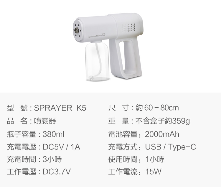 * 便攜式納米噴霧器,水霧極細,無殘留,效率高,噴液消耗少。2000mAh電量,持久穩定。