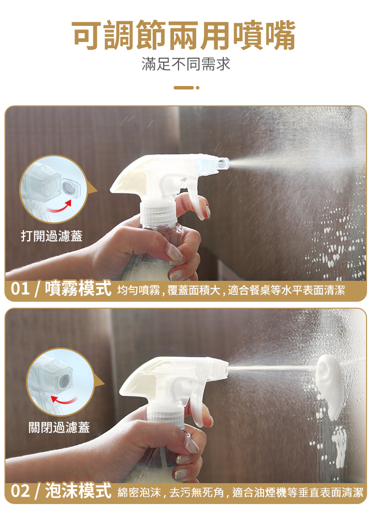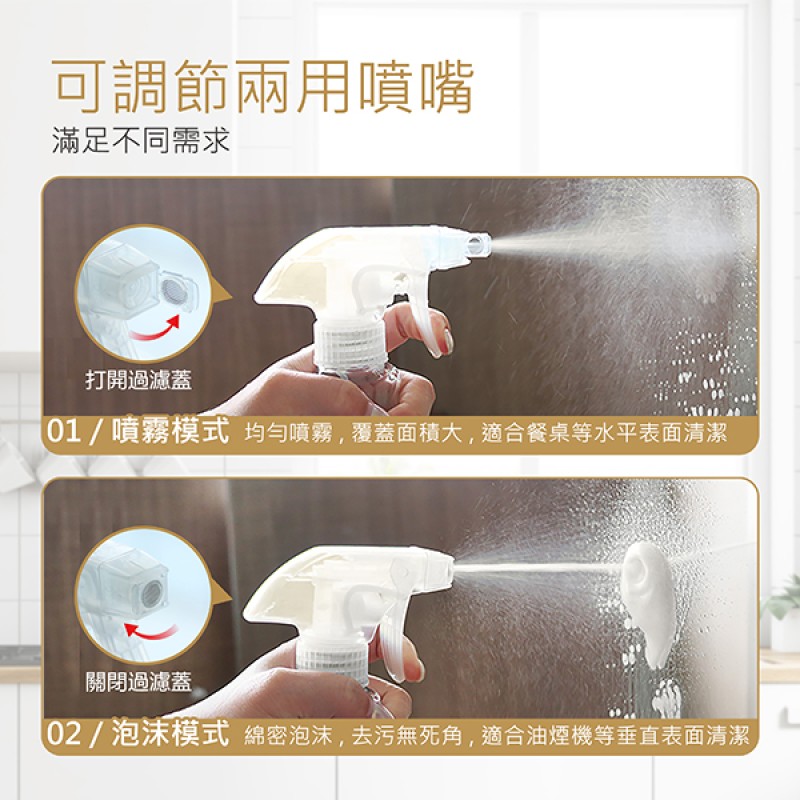 - 兩用噴嘴 噴霧及泡沬模式 泡沬濃密清潔效率高