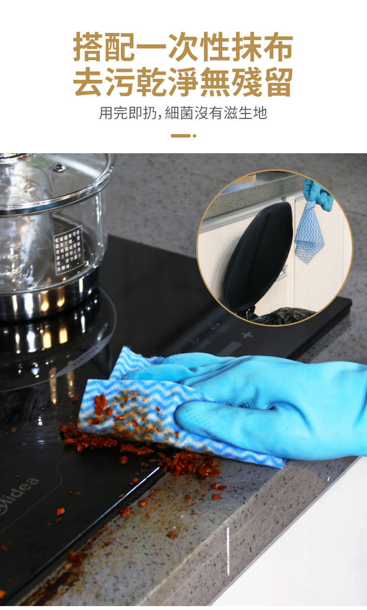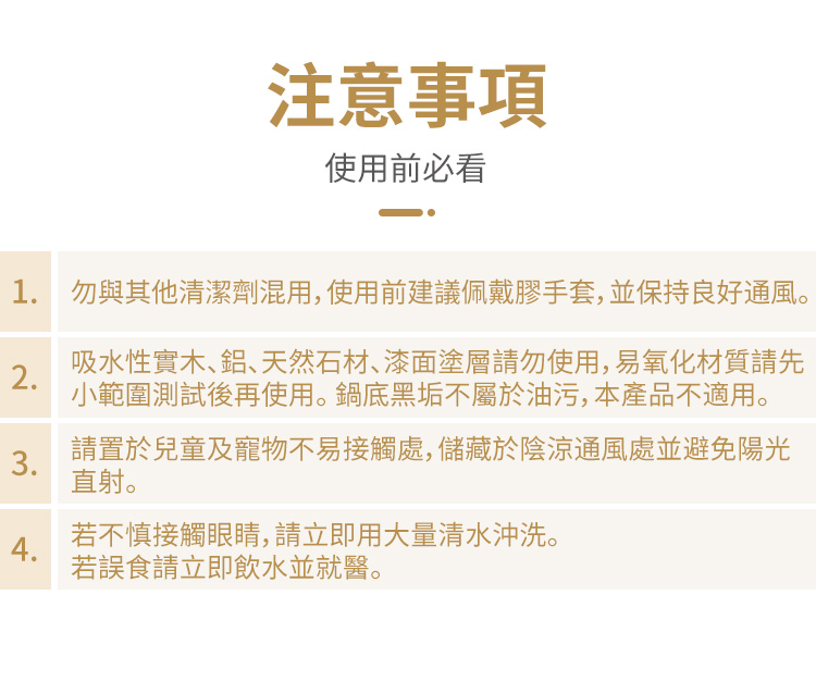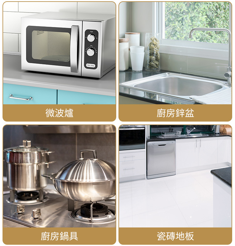 - 頑固油污可延長至5-10分鐘後才清潔擦拭