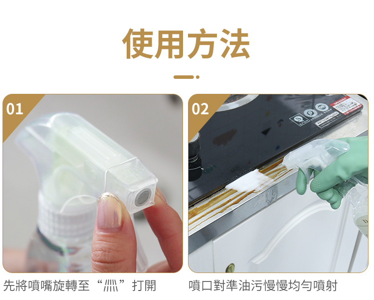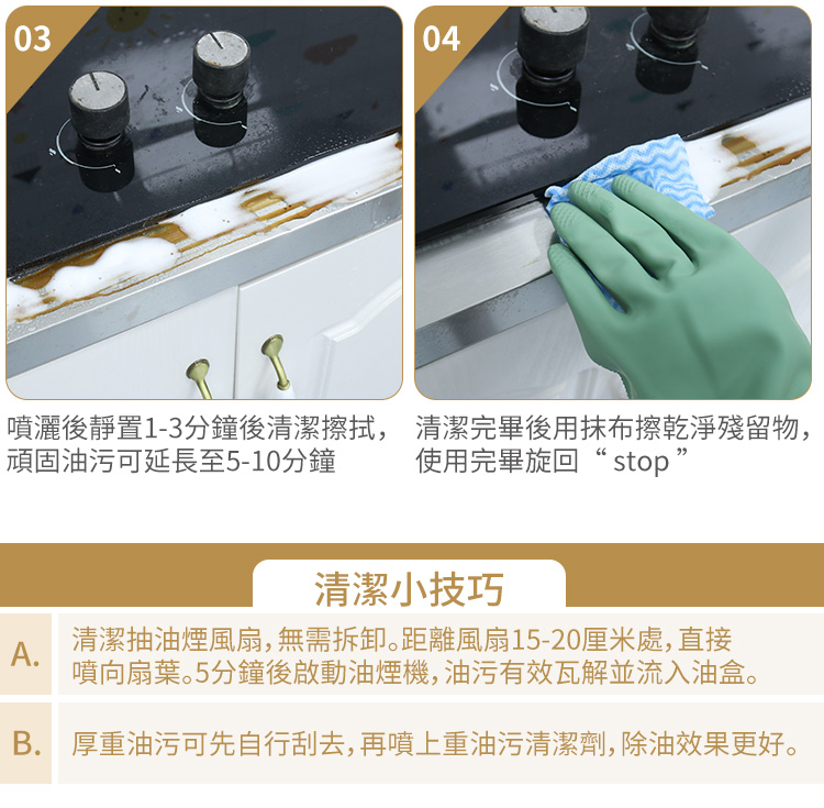 - 厚重油污可先自行刮去,再噴上清潔劑,除油效果更好