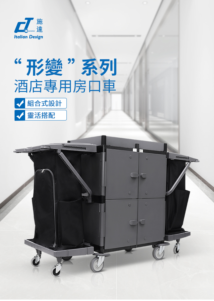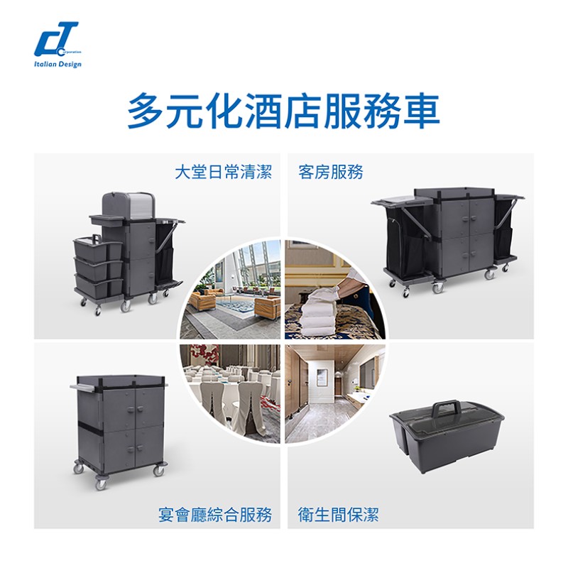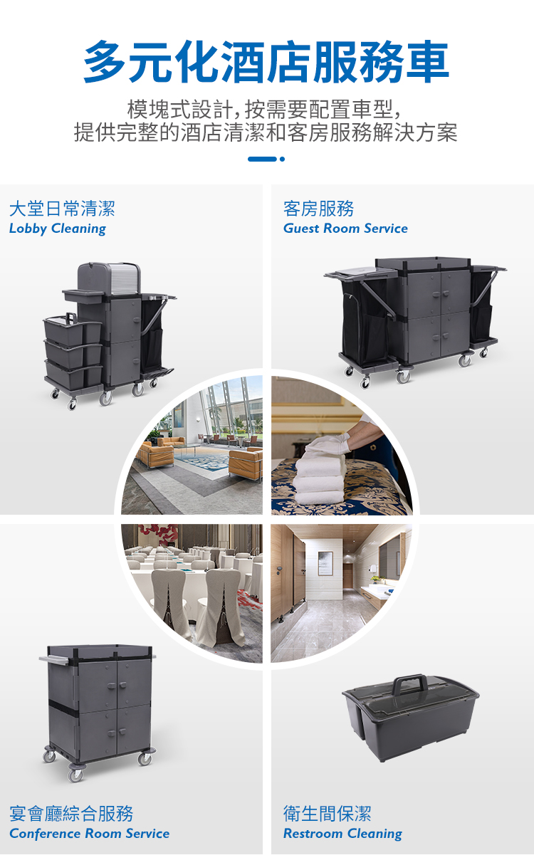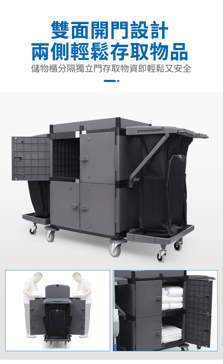 - 採用工程級別全新塑膠生產,堅固耐用,雙邊多開門的設計,存取布草物料更方便