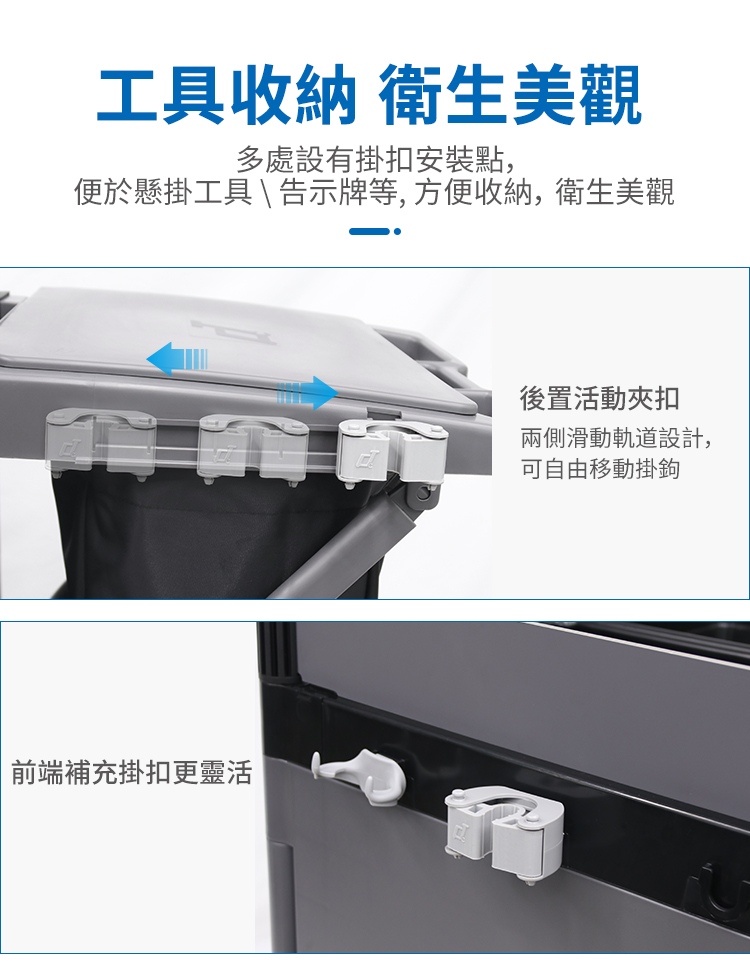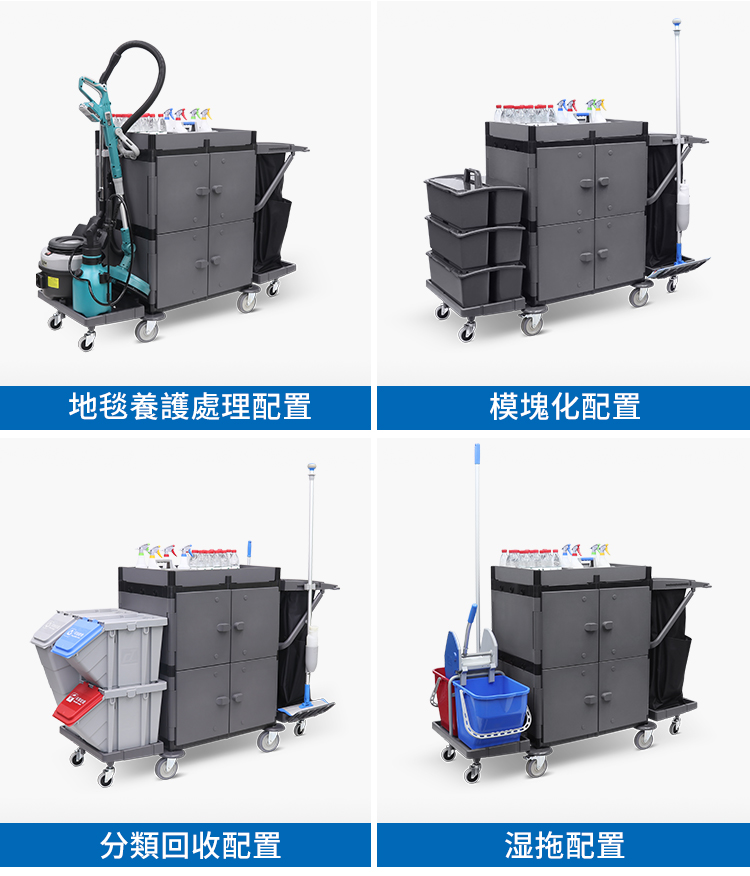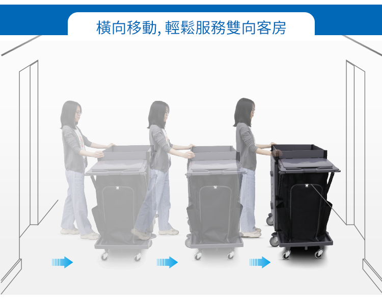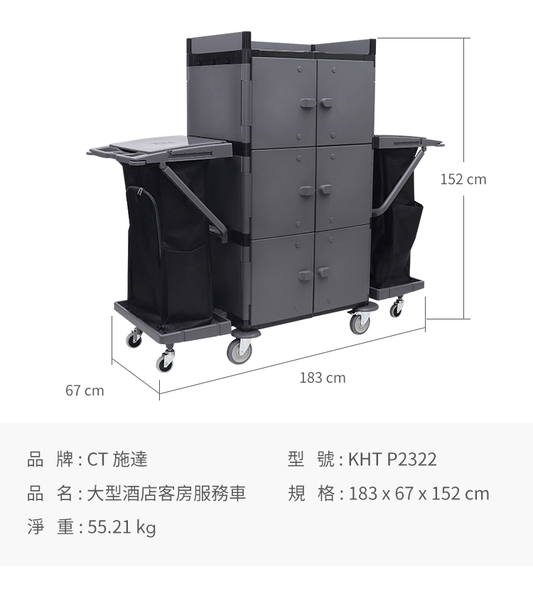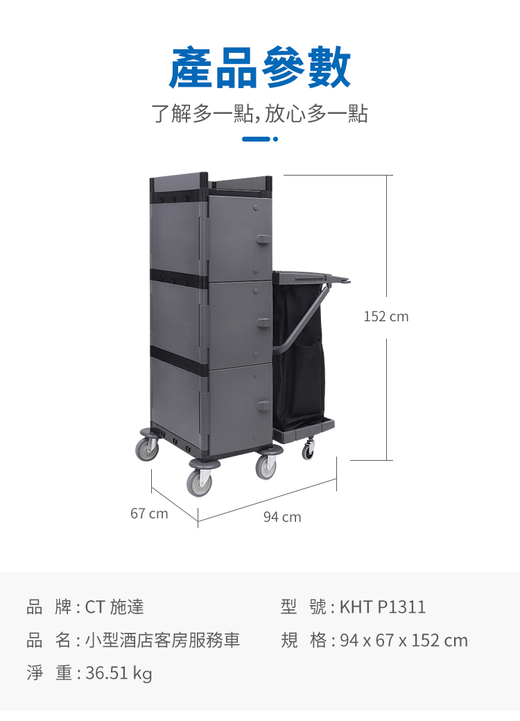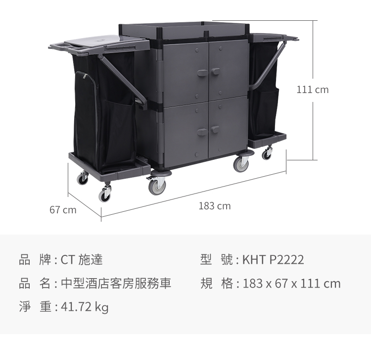 - 採用工程級別全新塑膠生產,堅固耐用,雙邊多開門的設計,存取布草物料更方便