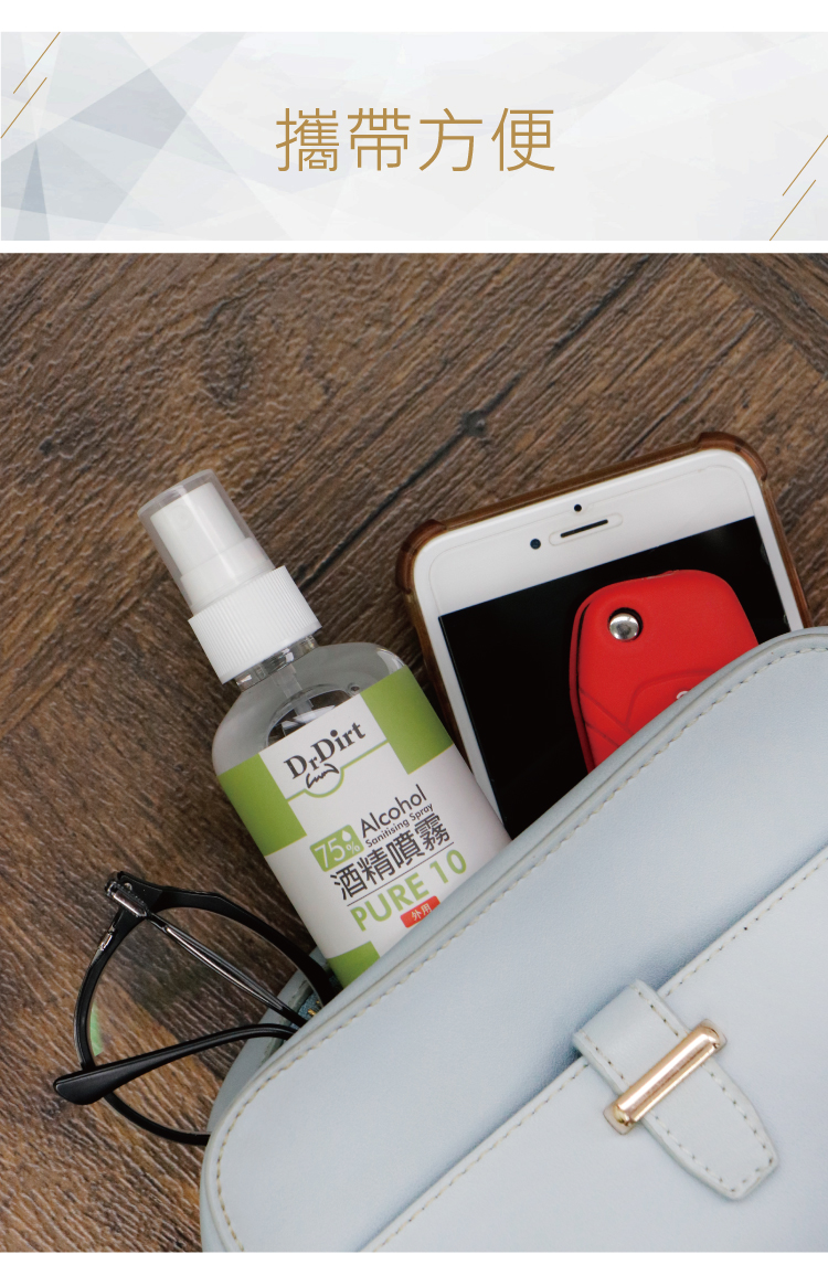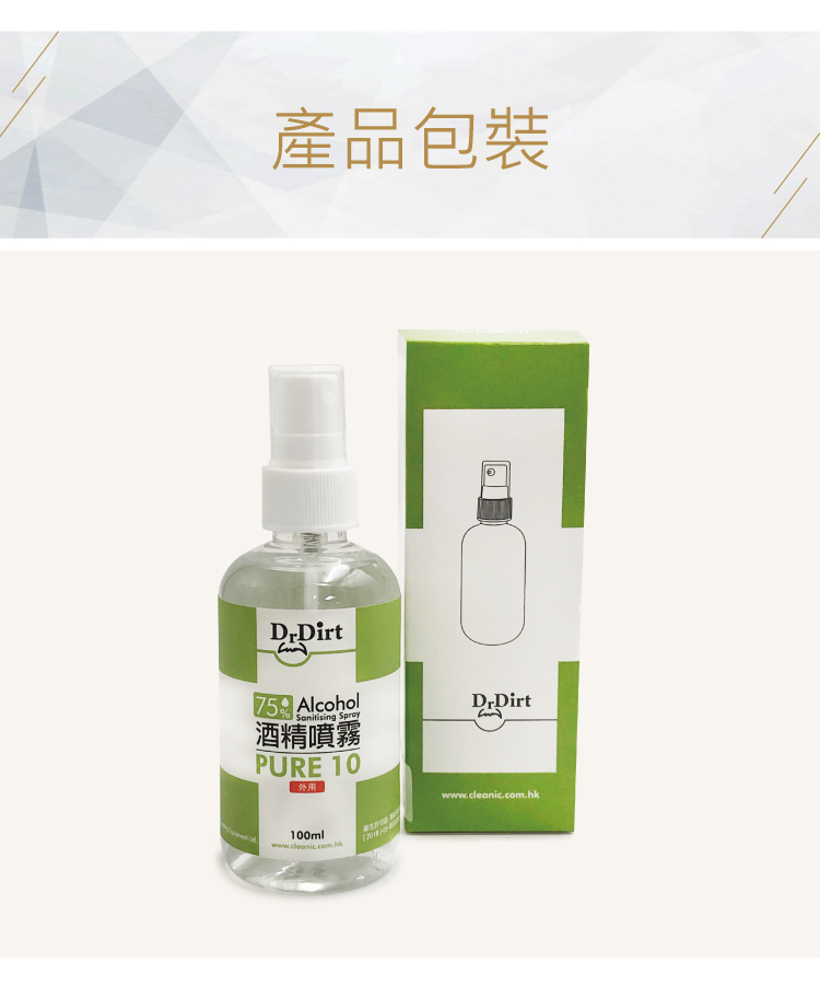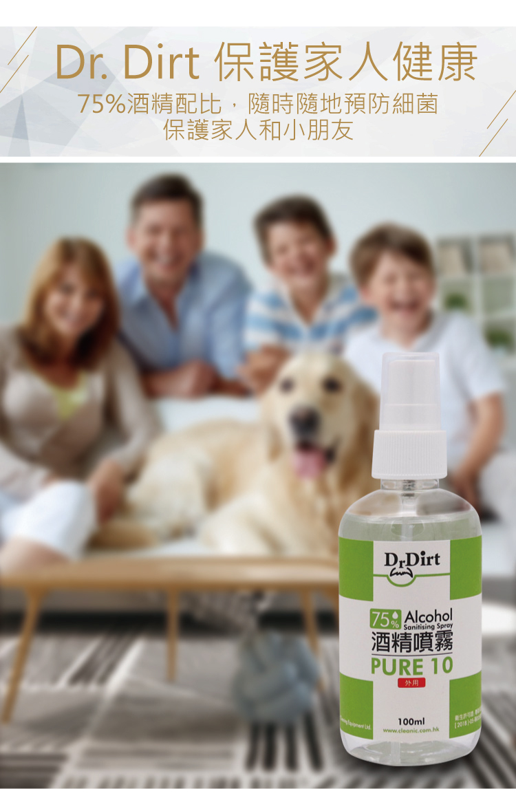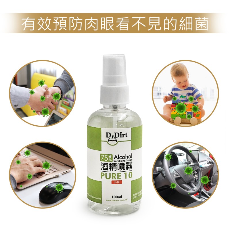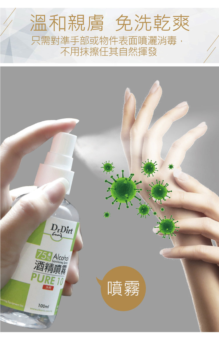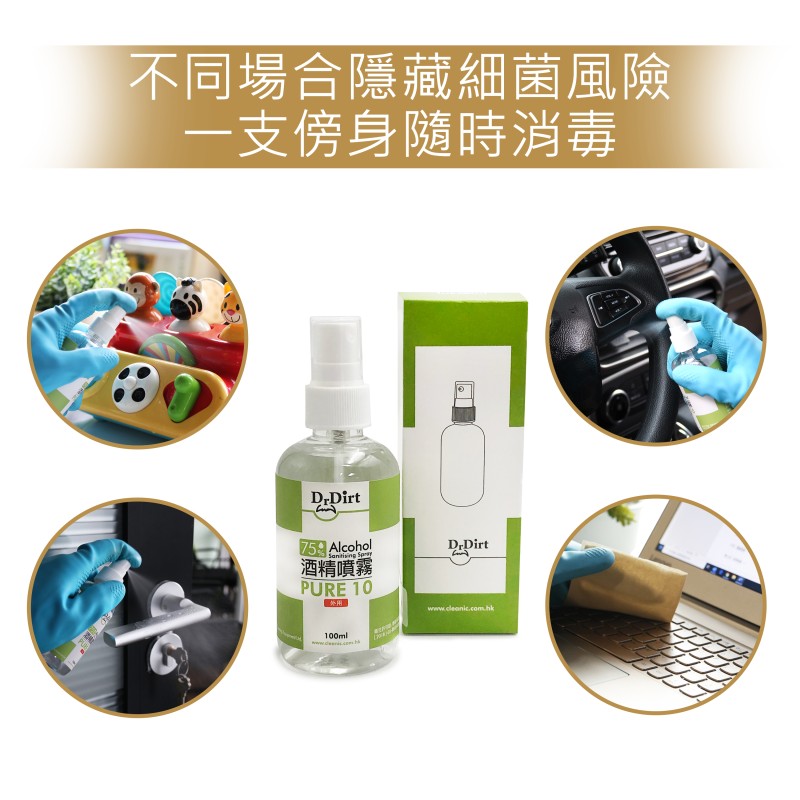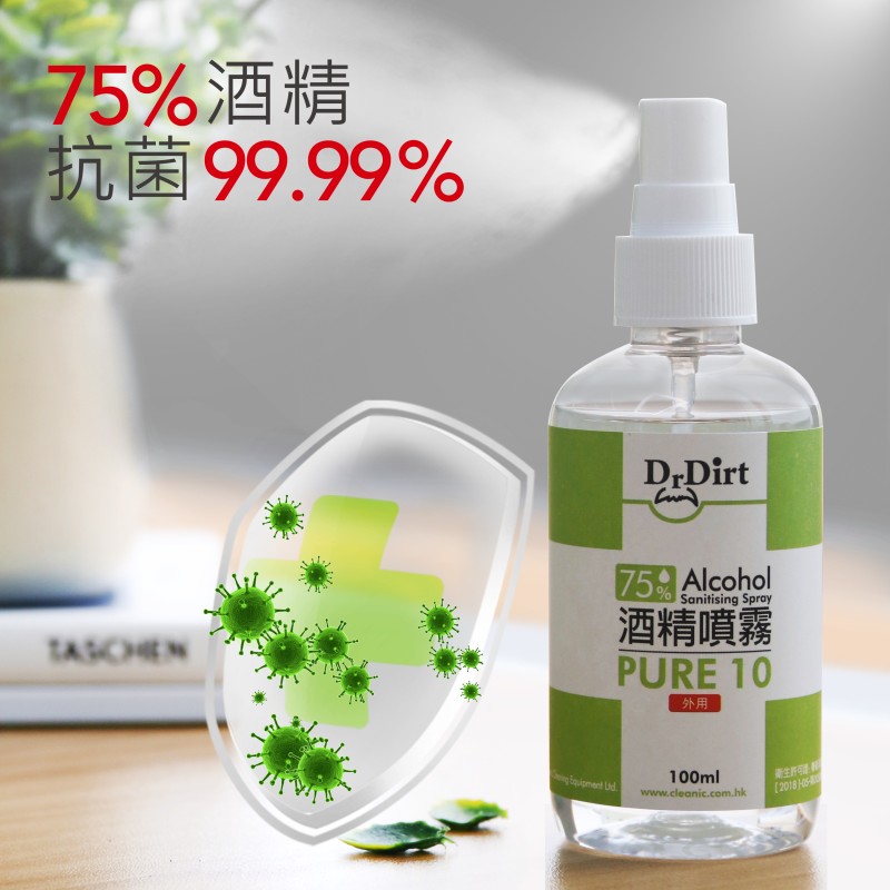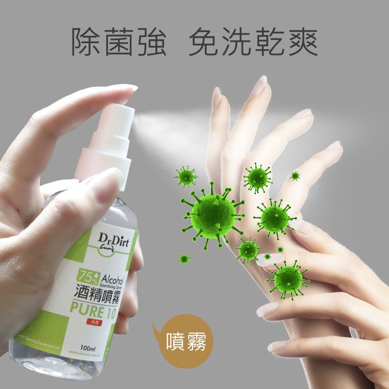 新冠肺炎疫情持續,出街除了要戴口罩防疫之外,雙手清潔都不容忽視!隨身攜帶乾洗手或是酒精噴霧消毒,已成為個人基礎必備衛生習慣,當你沒有水可以洗手時,真的好需要一瓶乾洗手,或是消毒噴霧去除看不見的細菌與與病毒。乾洗手怎麼選?市面上哪些乾洗手或是噴霧含有酒精抗菌成分呢? 醫療級消毒的理想選擇世界衛生組織指出,濃度70至80%的酒精溶液最有效殺菌. 香港品牌 -Dr.Dirt 酒精消毒噴霧濃度達到75% - 殺菌消毒噴霧殺滅99.9% 病毒及細菌 - 免沖洗 - 防止細菌及病毒散播,保障家人健康:可用於雙手丶皮膚,無需過水,方便快捷.