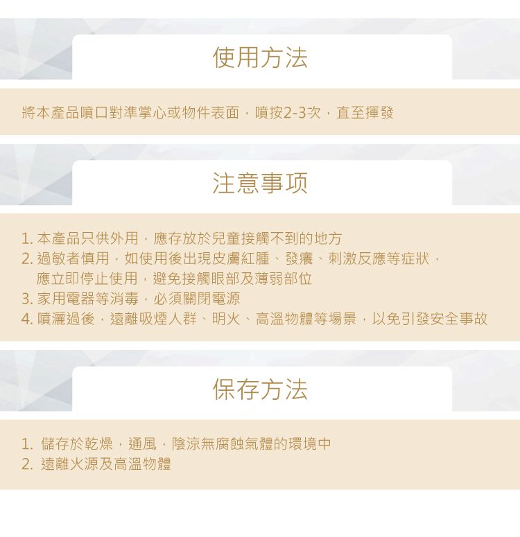 將本產品噴口對準掌心或物件表面, 噴按2-3次, 直至揮發。