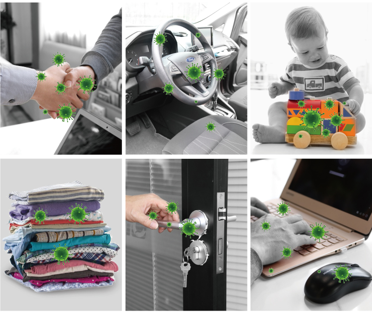 - 有效防止病毒及細菌散播, 有效於周圍的物件表面使用