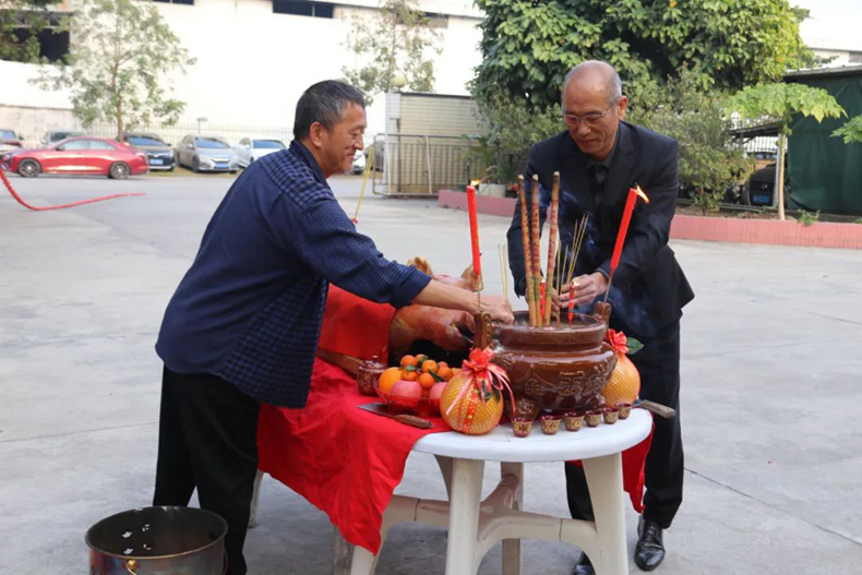 2025年2月14日,健力集團蛇年春茗活動,吳董(左)與黃董(右)主持祭祀儀式,祈求全體同事們事事順利、集團事業蒸蒸日上,也借此傳遞健力不畏困難、勇於挑戰的精神。