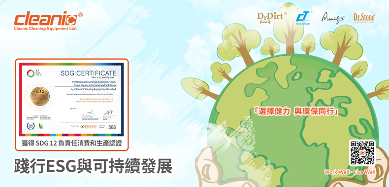 健力集團一站式解決難題!旗下清潔器械、工具、竹漿紙品、清潔劑及保潔方案,統統拿下 SDG 12 (負責任消費和生產)證書與標籤。