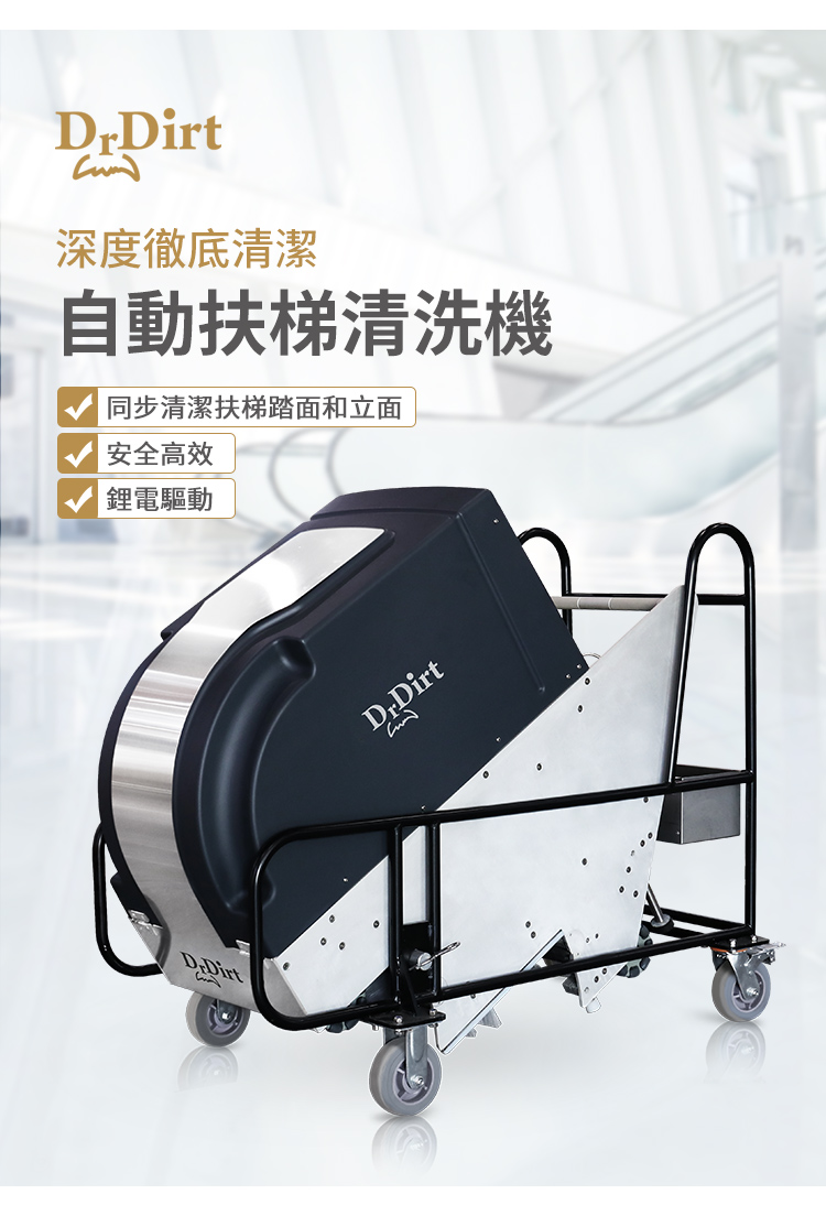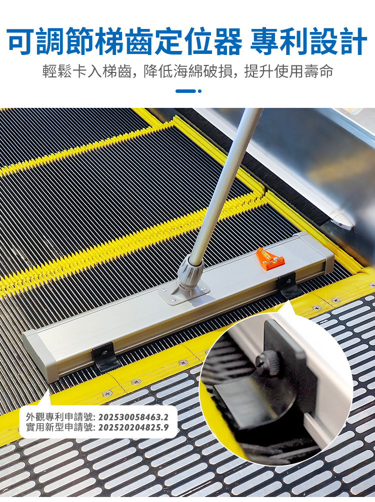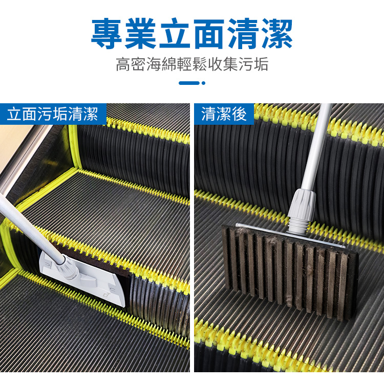 這款機器集噴灑、刷洗、吸乾功能於一體,能同時對扶梯的踏面和立面進行清潔。它的刷頭設計貼合扶梯的凹凸結構,在運轉過程中,先將水均勻地噴灑到滾刷上,然後通過高速旋轉的刷毛對踏面和立面進行深度刷洗,將頑固污漬徹底清除。之後,機器會迅速將污水吸幹,避免二次污染和流到電梯底部,清潔效率極高。