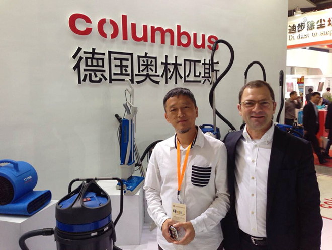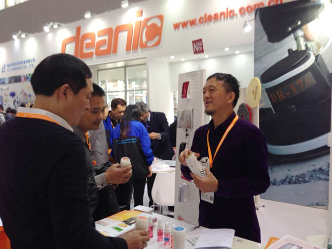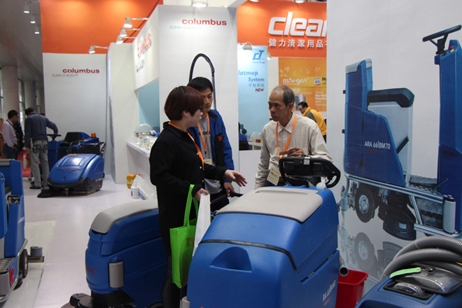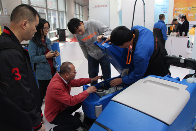 健力公司技術部歐先生在展場解說洗地機的使用功能