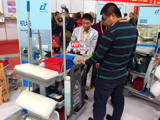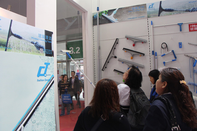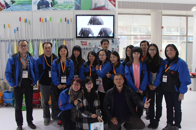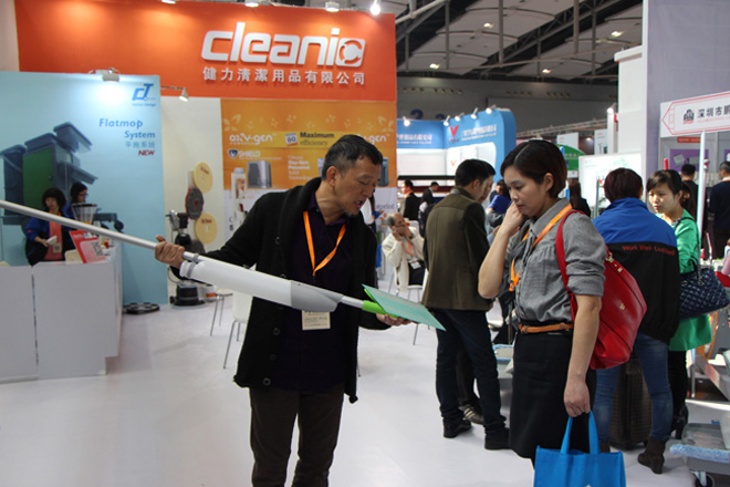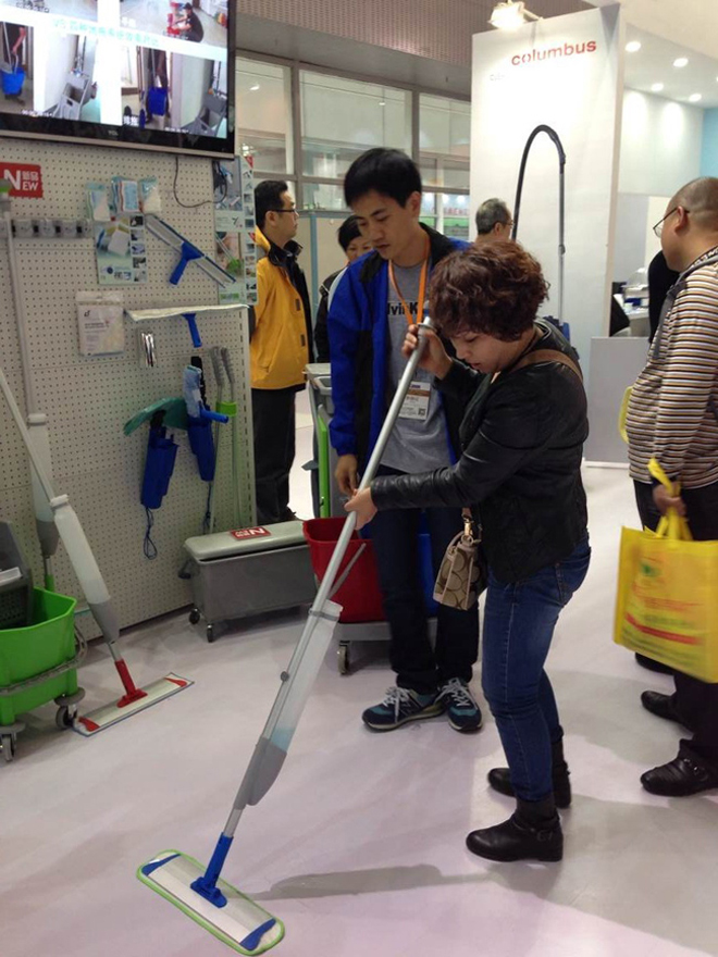 健力集團執行董事吳永新在現場展示新品噴灑平拖的功能