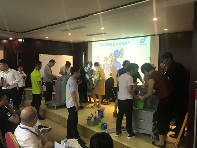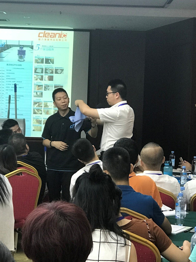 通过讲解展示,结合现场日常保洁工具(除尘、湿擦、拖地、垃圾收集等专项)的小比赛,连同笔试,对通