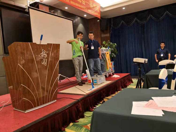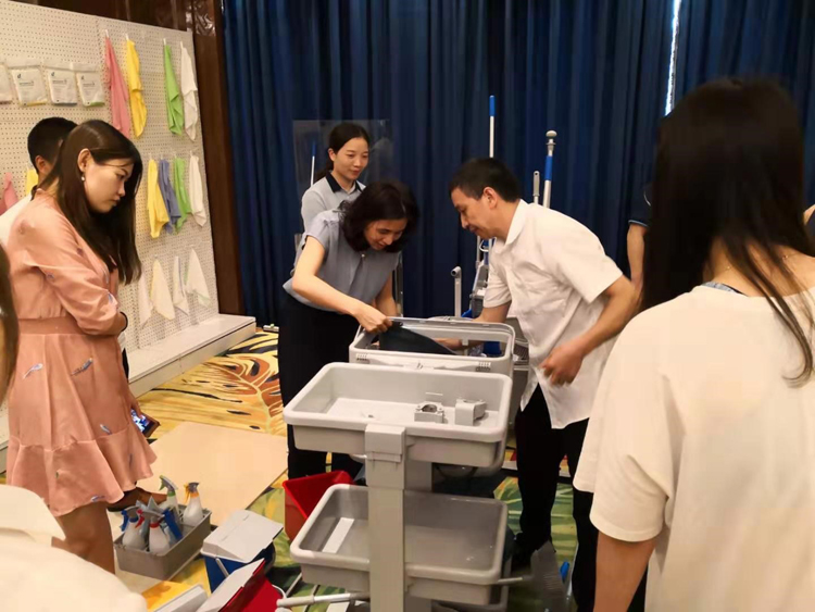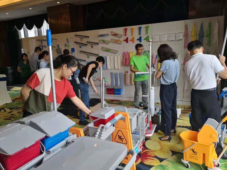 结合拼装清洁服务车的小比赛,让来宾们深刻体会到日常保洁中工具的搭配及使用。