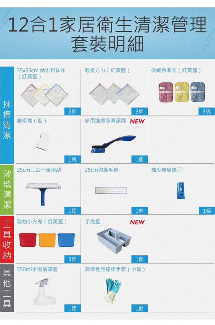 - 12合1之清潔套裝,方便攜帶,收納井井有條