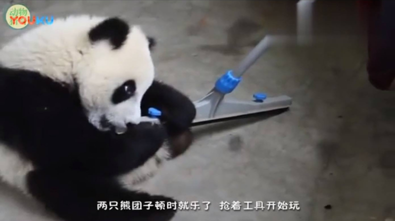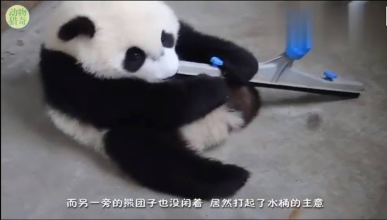 看,圖中的熊貓捉住飼養員的推水扒不肯放,你認得出這就是