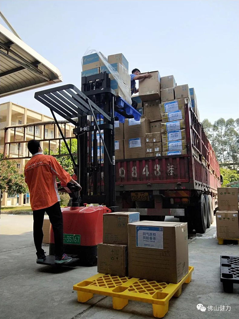 同事正在緊張將發往武漢雷神山醫院的物資裝車。