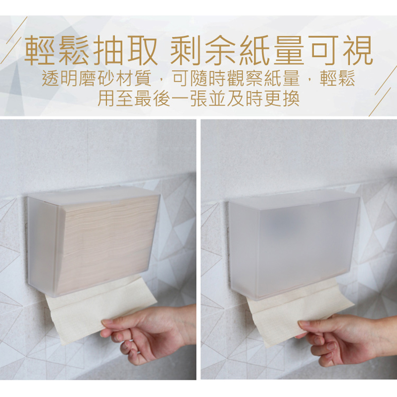 現配有小巧實用的免釘孔超薄慳位紙巾盒,四面密封,防止水花濺射,防水防潮。透明磨砂材質,可隨時觀察用紙量並可及時更換。不論在廚房,客廳,浴室也能方便使用。配有3M背膠,即粘即用,免除鑽牆之苦。環保又衛生!