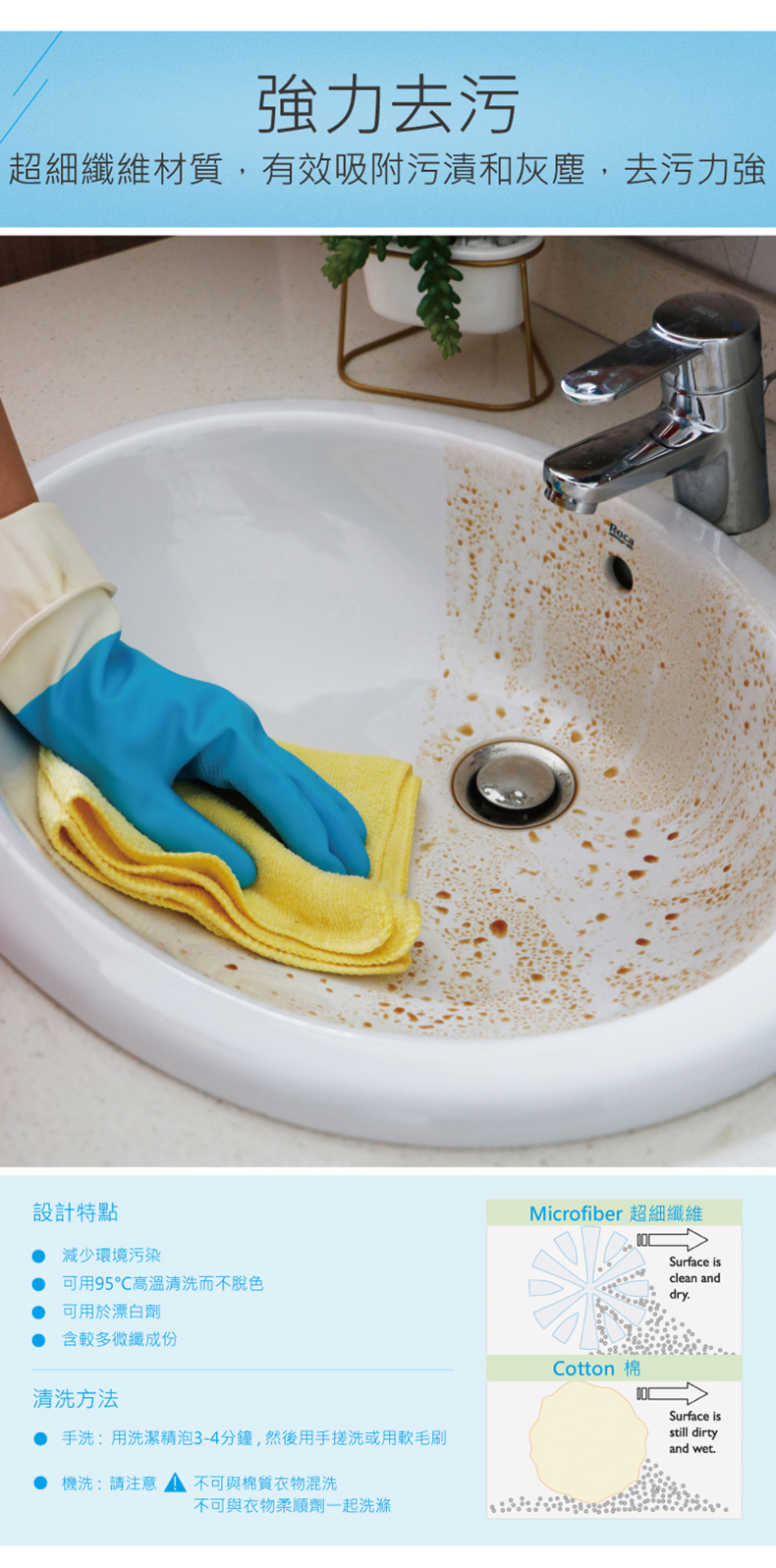 * 超微細纖維結構,能迅吸納塵埃而毋須使用清潔劑;