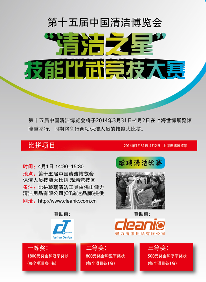 一年一度亞洲清潔行業第一大展之一的第十五屆中國清潔博覽會將於2014年3月31號至4月2號舉行
