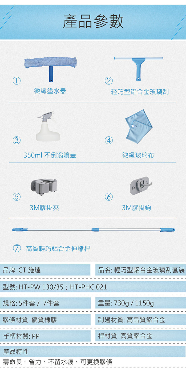 - 伸縮桿:方便清潔高處玻璃