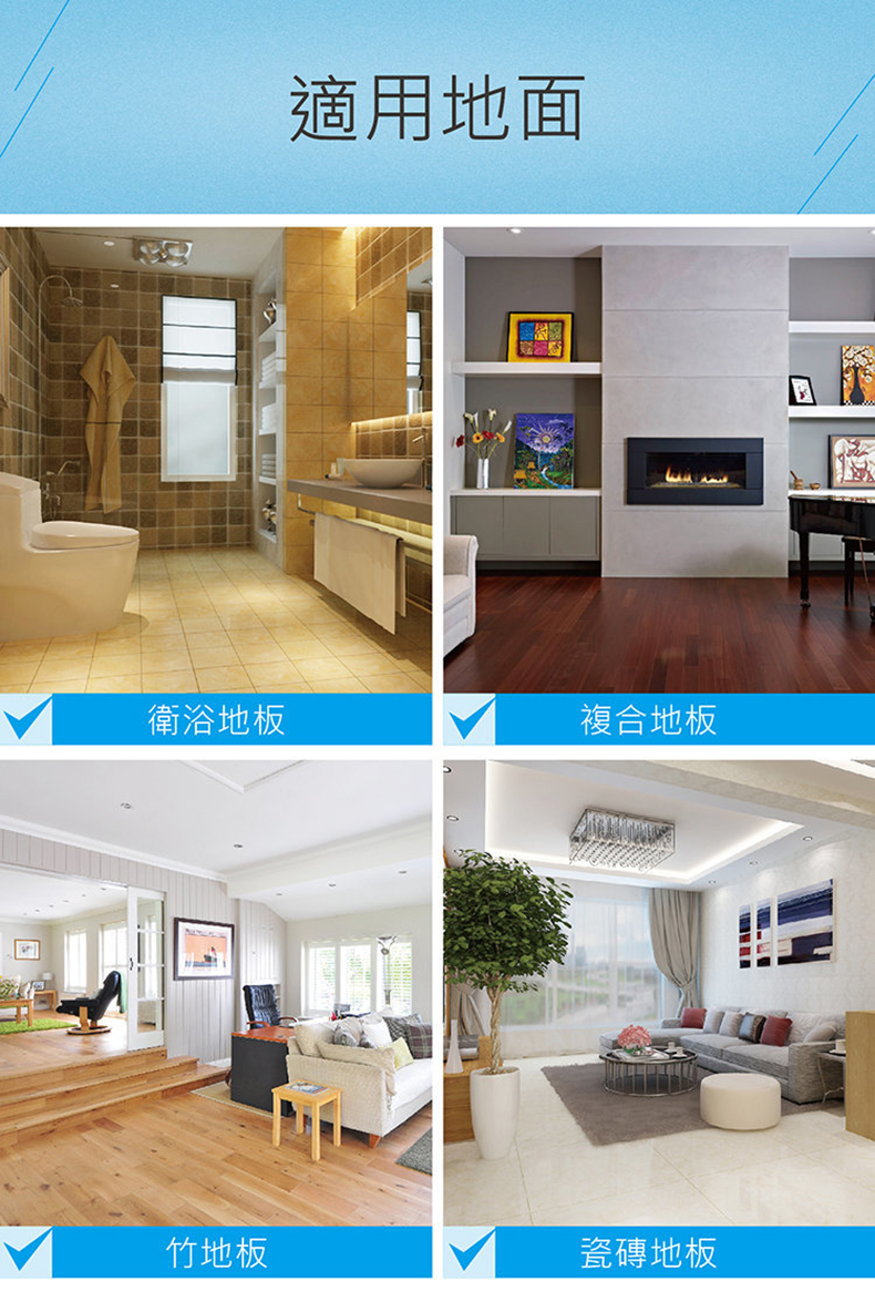 - 適合木板地面、瓷磚地面和石材地面