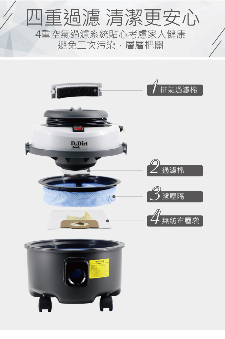 好在比我遇到一部有四重空氣過濾系統,避免二次污染的DrDirt 吸塵機!它操作輕巧、低噪音,不怕嚇到毛小孩;利用不同刷頭,每個角落都顧到;配有一次性無紡布塵袋用完即扔,不用額外清洗濾塵箱,避免污物碎屑堆積而發嗅、滋生細菌。