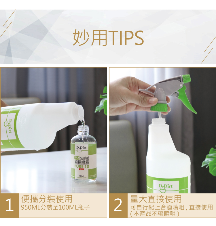 咁多疑問,點解唔直接用Dr.Dirt免洗75%醫用酒精消毒噴霧?因是75%醫用酒精,可以直接噴灑餐具,及周圍的物件表面如餐桌,作清潔消毒,比單用水浸洗和用濕紙巾抹更安全衛生。