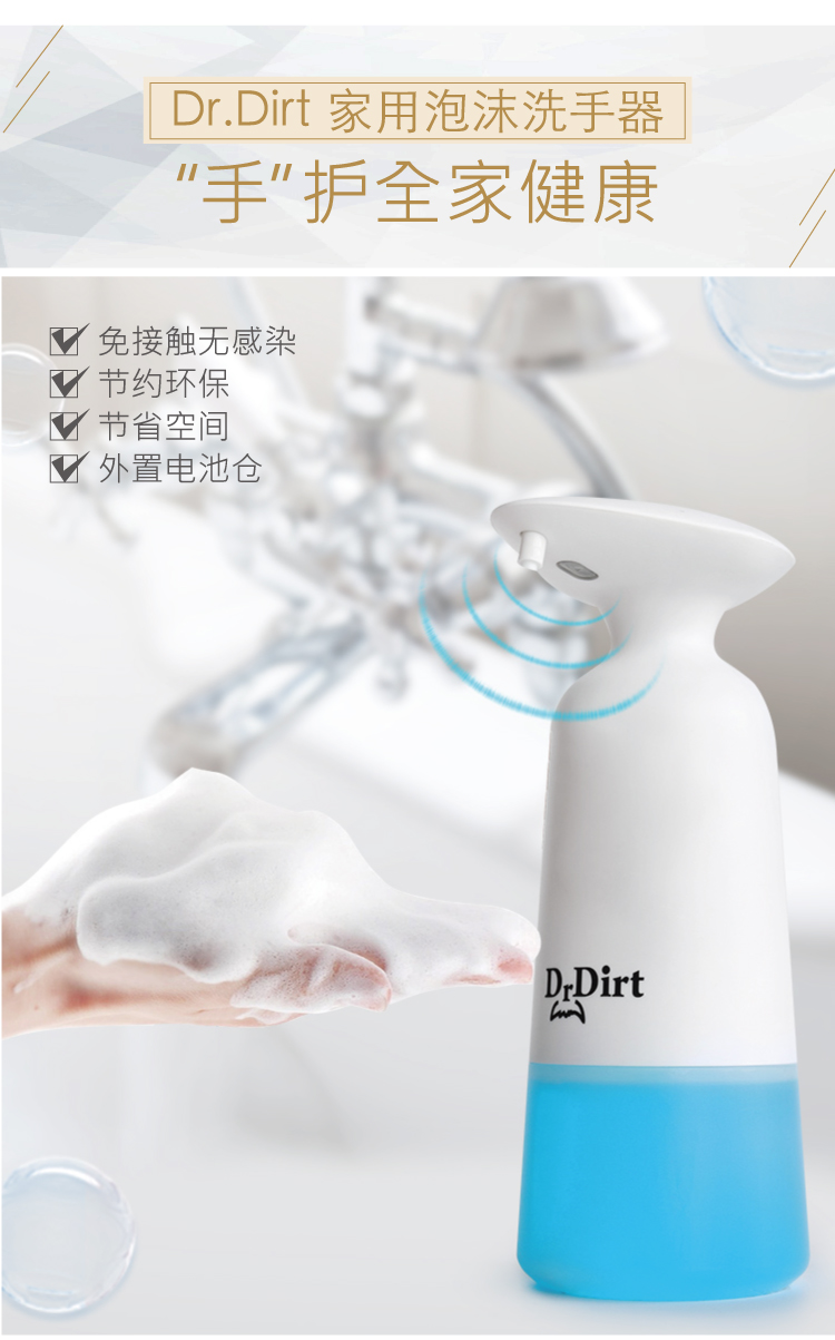 為避免雙手在洗手前會接觸水龍頭、按泵裝洗手液等。不如改用Dr.Dirt免觸感應泡沬洗手器,就方便多了。伸手到自動感應器噴咀下方,即可感應而快速噴泡,夠你洗淨一對手。換做以前用普通泵裝洗手液,按完泵頭,洗手後又要洗埋個樽,而家就衛生好多。