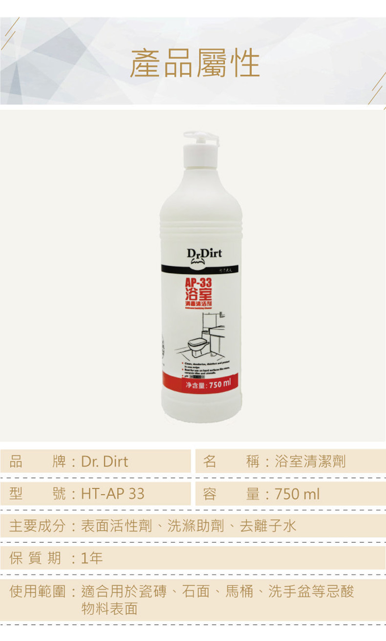 雖然坊間有教可用1:99稀釋家用漂白水、小梳打粉等,但要左溝右溝都煩,何不起始就用Dr.Dirt浴室消毒清潔劑來幫手,瓷磚、石面、馬桶、洗手盤等忌酸物料表面,一支攪掂,病毒無得匿。還能除去異味,同時在瓷磚表面像加了一層保護膜,爽潔閃亮,保護瓷磚表面不易沾染污垢,具抗污作用。