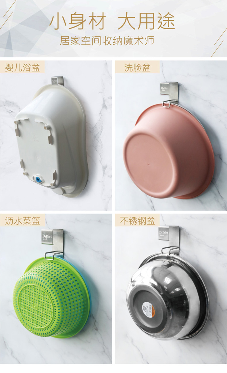 「Dr.Dirt不鏽鋼強力掛鈎StainlessSteel Hooks」讓你無需電鑽的免釘膠安裝掛鈎,它能承重10kg,安在廚房可同時懸掛多個盆或瀝水篩,安在洗手間可同時輕鬆懸掛嬰兒盆和洗瞼盆等,輕鬆收納,增加工作活動空間,免釘牆安裝,防水防潮,強力承重,304不鏽鋼,結實耐用不變形。