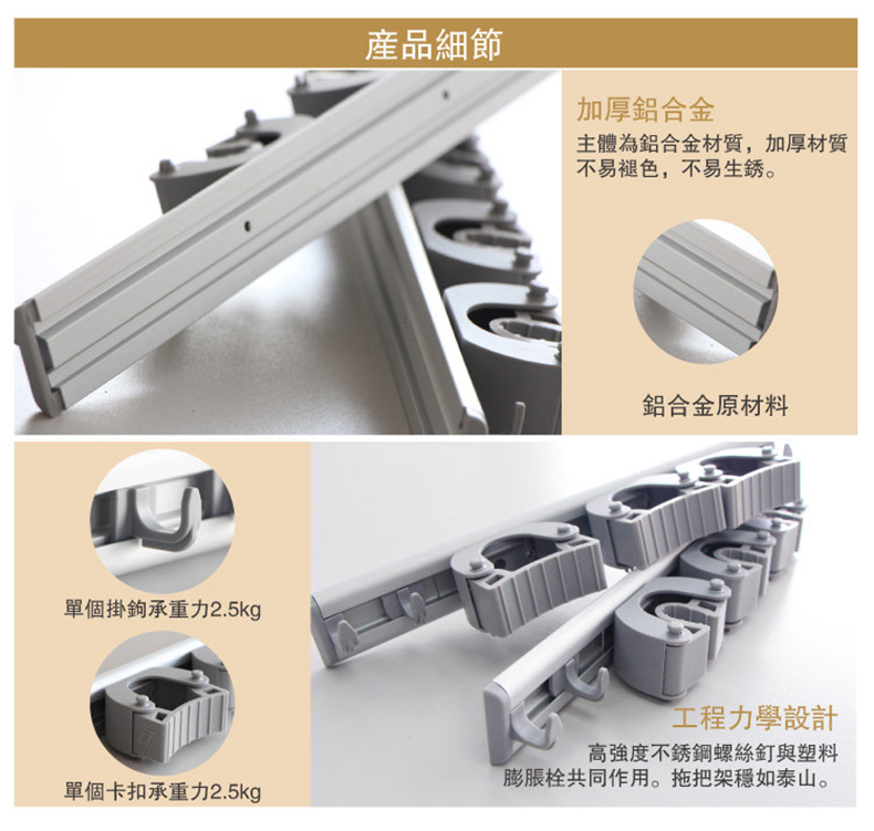 只要安裝Dr.Dirt 拖把掛牆收納架!免鑽牆鋁條軌道,獨立部件可以靈活更換,一推夾穩,一拉提取。拖把、掃把、雨傘、拐杖統統一次過妥善放好。細心設計的置物掛鉤,連廚房抹布都有容身之處。容易安裝,收納省心,也可減低家居意外和不便。另有單夾扣選擇,承重達2.5kg,一按固定,一拉提取,靈活收納,滿足不同需求。