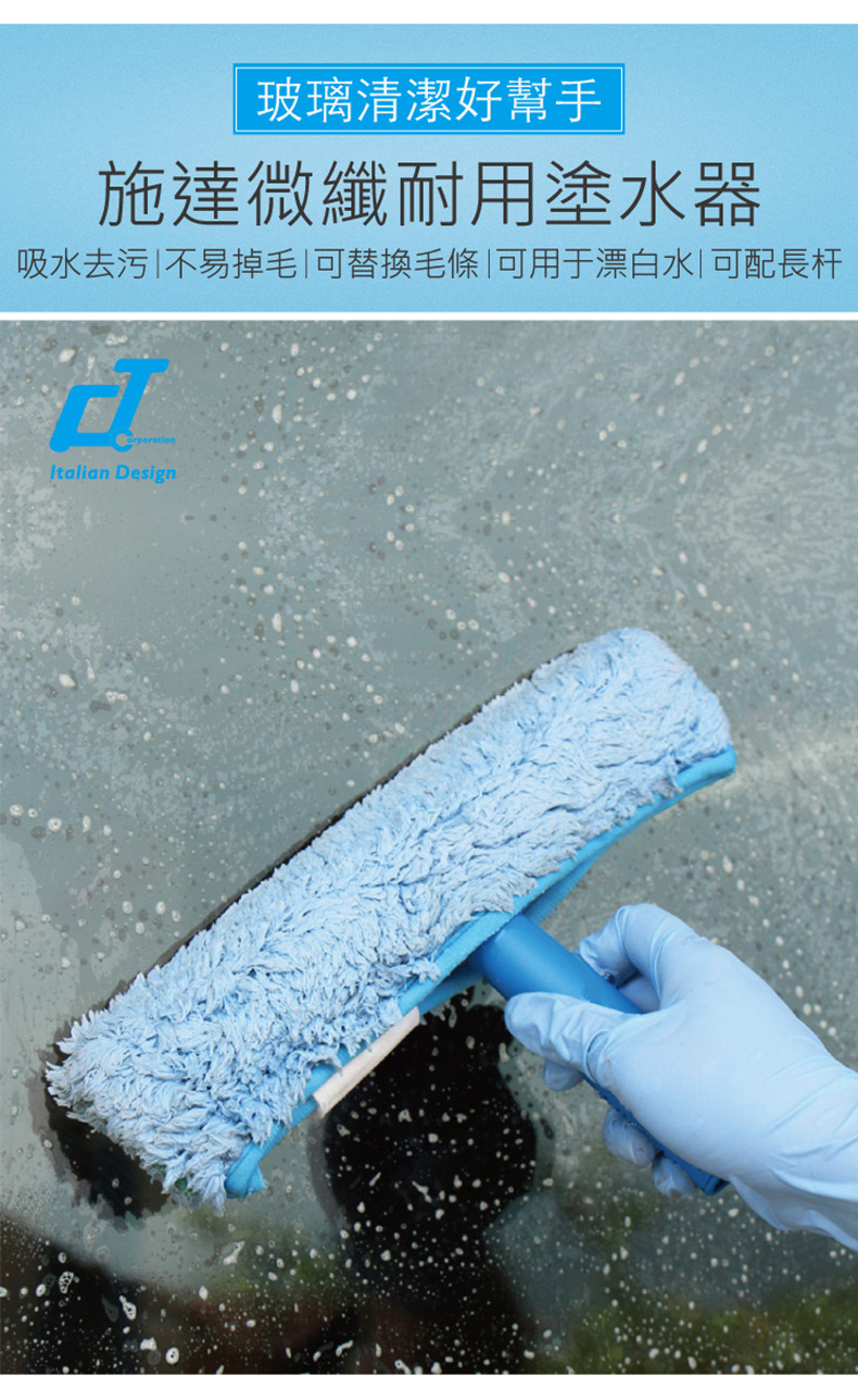 CT微纖塗水器採用超細微纖編織,吸水去污強,可直接濕水或配合清潔劑使用,塗水器毛條側邊配有刮擦布,可用來清擦頑固污漬,而毛條和手柄還能拆卸,亦可搭配長杆使用,毛條清洗之餘,也可以隨時替換,不易掉毛,可用于漂白水。