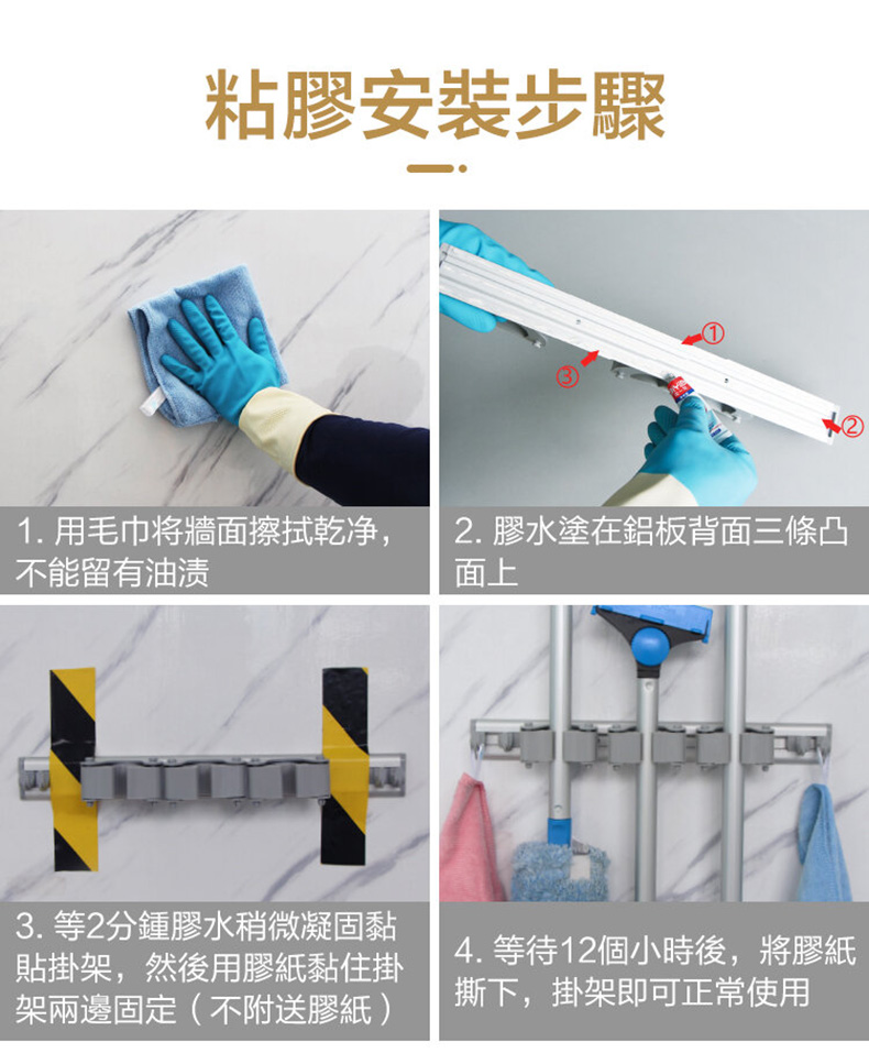 施達多功能清潔工具掛架可採用粘膠(玻璃膠)安裝的方式,實現無痕安裝,隨時根據需要改變安裝地點。也可採用鑽孔安裝的方式。