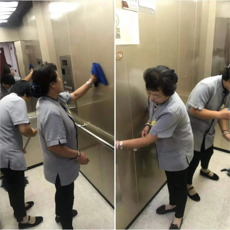 2、將蘸有中性清潔劑的微纖抹布沿轎廂內壁從上到下,從左到到右,用八字法抹擦,去除表面污漬灰塵。