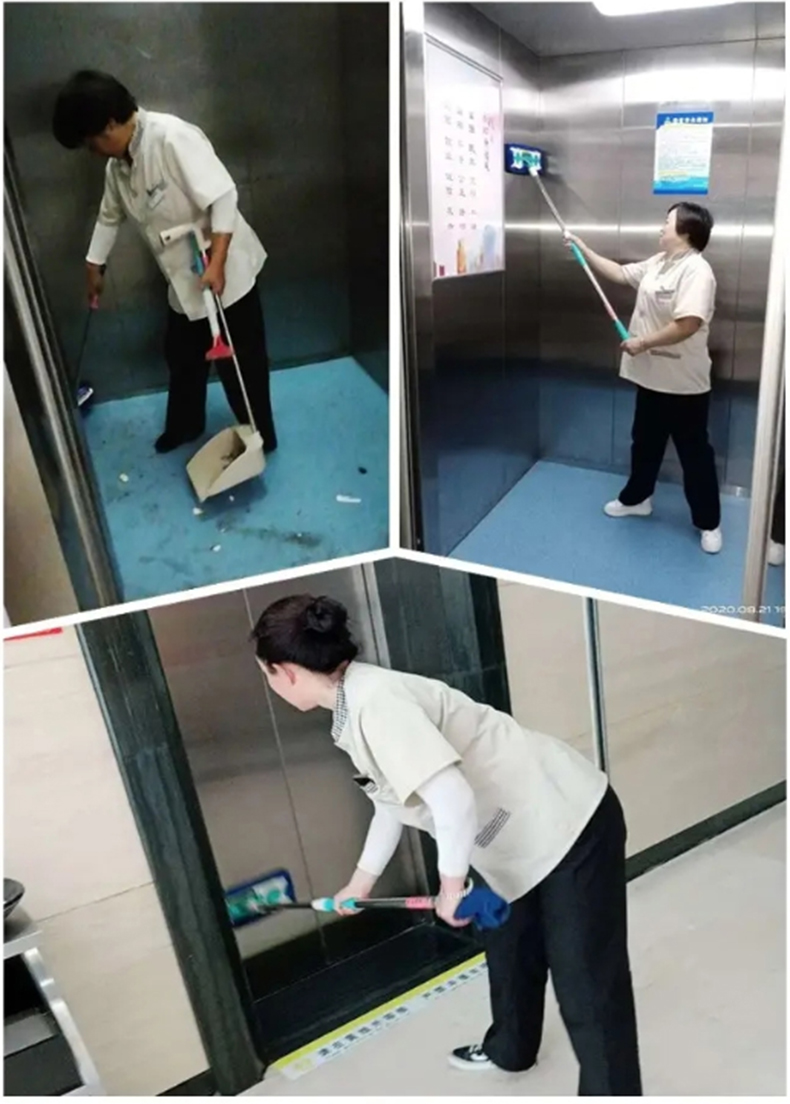 1、高處的轎廂內壁,建議用伸縮桿搭配帶刮擦二合一玻璃刮先清理上半部分,抹布蘸上中性清潔劑後擦拭,然後用刮頭部分直接刮干水漬,避免留有水珠沾灰塵。