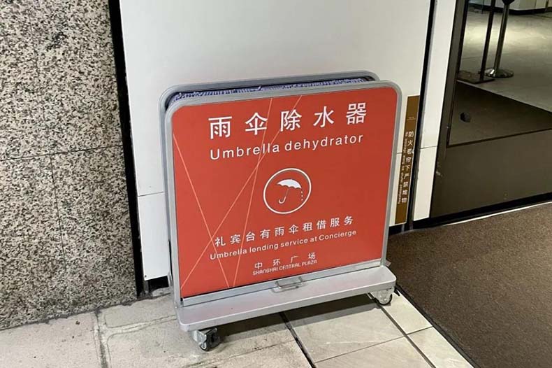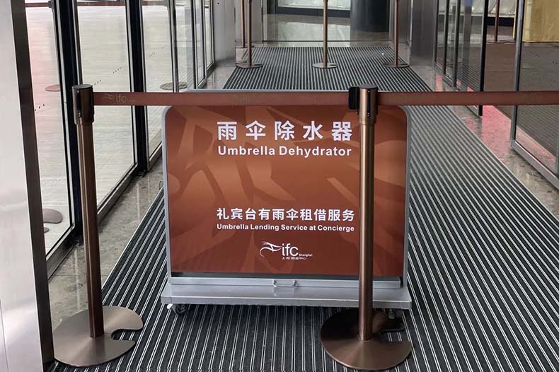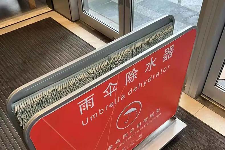 其旗下的物業,新近引入了“雨傘除水器”裝置,長柄雨傘放入其中左右搖擺,兩側的吸水海綿便會將傘表面的積水吸走。