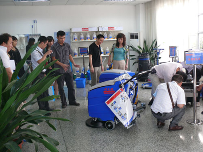 參觀團成員詢問奧林匹斯自行式洗地吸乾機的操作方法。
