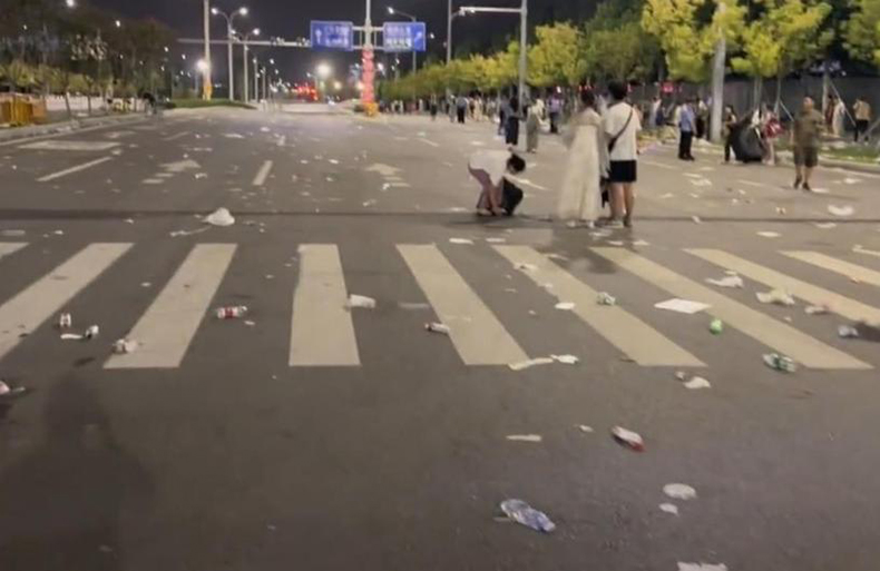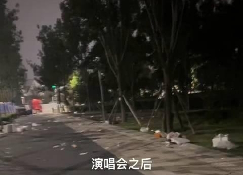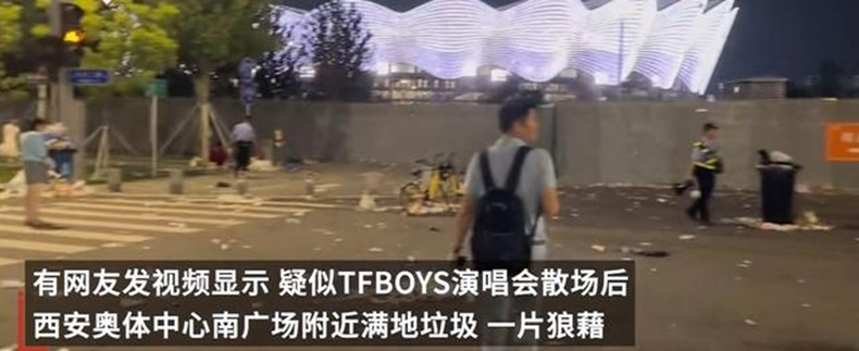 8月6日,陝西西安。有網友發視頻顯示,疑似TFBOYS十周年演唱會散場後,西安奧體中心南廣場附近滿地垃圾,一片狼藉,地面遍佈紙張、杯子、食品包裝等各種垃圾。