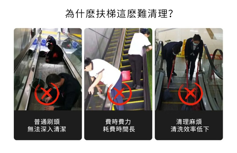 相信很多做清潔或物業管理的人都會發出這樣的吶喊,為甚麼扶梯這麼難清理呢?要全面地清潔一次扶梯,我們往往要花很多人力和時間,而且效率還特慢,還清潔不了深層的污漬。
