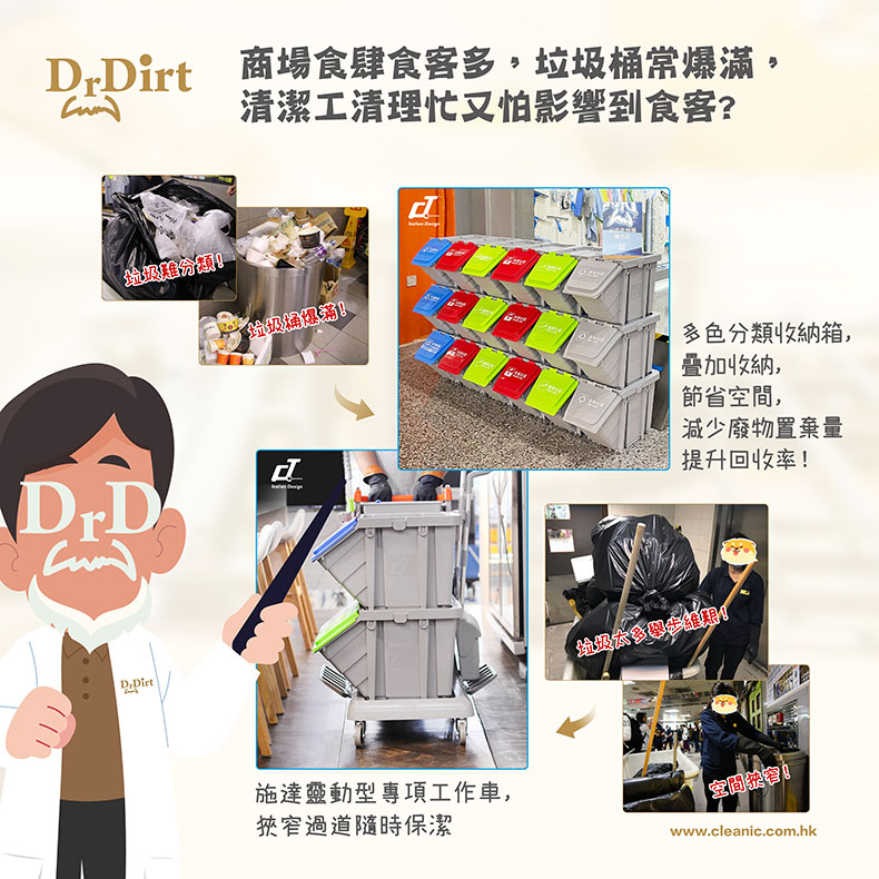 負責清潔商場的清潔工,每日的其中一項工作就是要清除一座又一座的垃圾山,每次清理時都要防止「山泥傾瀉」,把垃圾山收服在黑色垃圾袋中,一袋垃圾最重有60斤,經常做到腰酸背痛。每當一不留神,垃圾山內的咖喱汁、豉油汁即散落一地,又要花更多時間收拾清理。