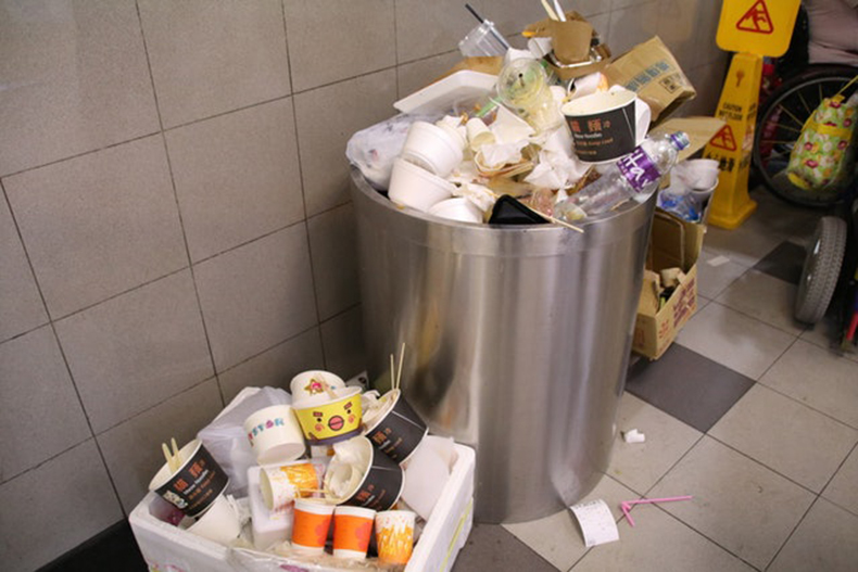 當食客愉快地享用香噴噴的美食後,隨手把一個又一個塑膠盒、發泡膠碗、膠杯等丟棄時,意味清洁人员的工作量又再增加。需要每小時清理半個樓層的垃圾桶,對付堆積如山的垃圾、污漬斑斑的地面,動輒花上接近一小時,完成後喝幾口水再次出發,繼續清理已經爆滿的垃圾桶。