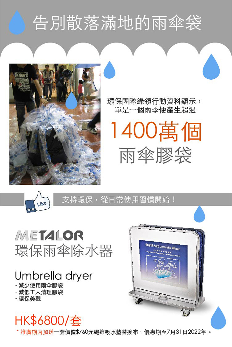 - 超強吸水纖維,迅速去除雨傘水滴, 採用黏貼式設計,方便更換清洗,防止細菌滋生。
